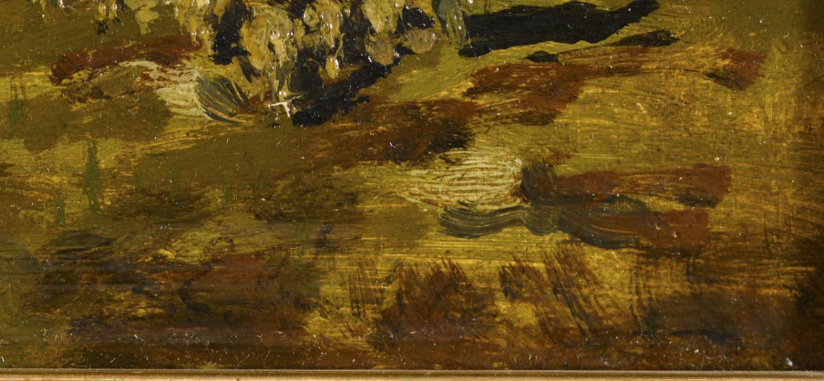 Oil/Wood. Lower right faint residual signature, verso inscribed / motif statement.