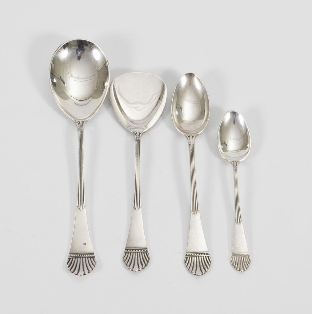 2 different sugar spoons, 6 coffee spoons and 6 mocha spoons. All in Art Deco style, with fan-shaped handle ends.