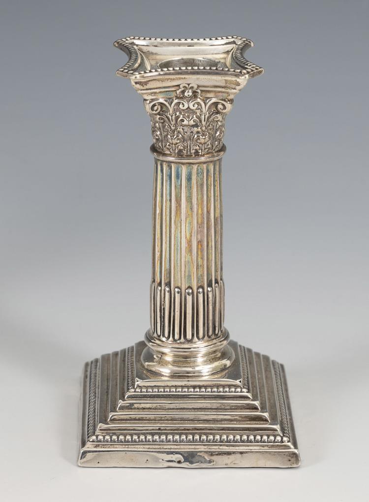 Pair of 1-flame English table candlesticks. Both dented at base.