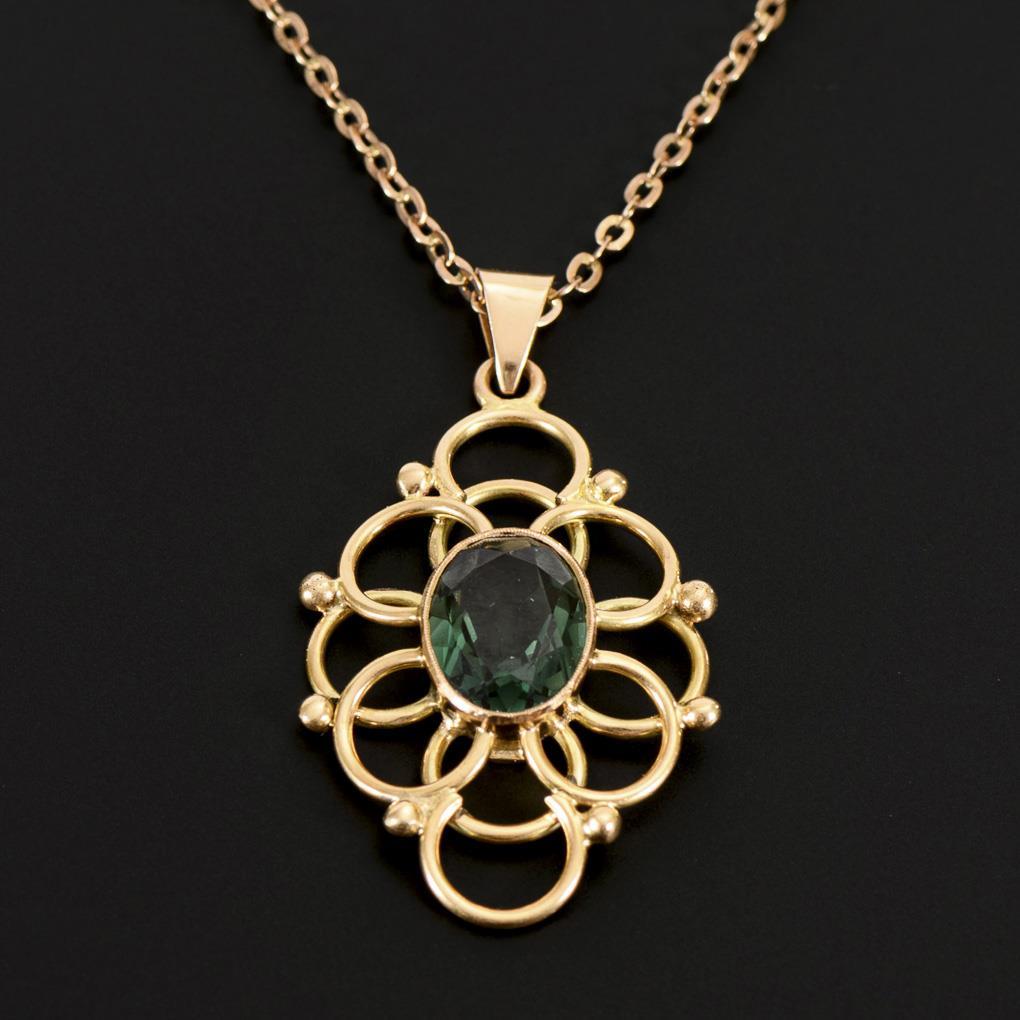 Frame set tourmaline in ring decorated frame, on long anchor chain with ring spring clasp.