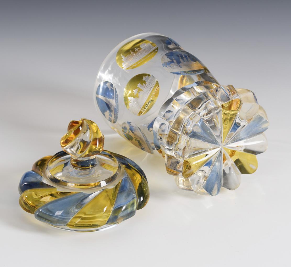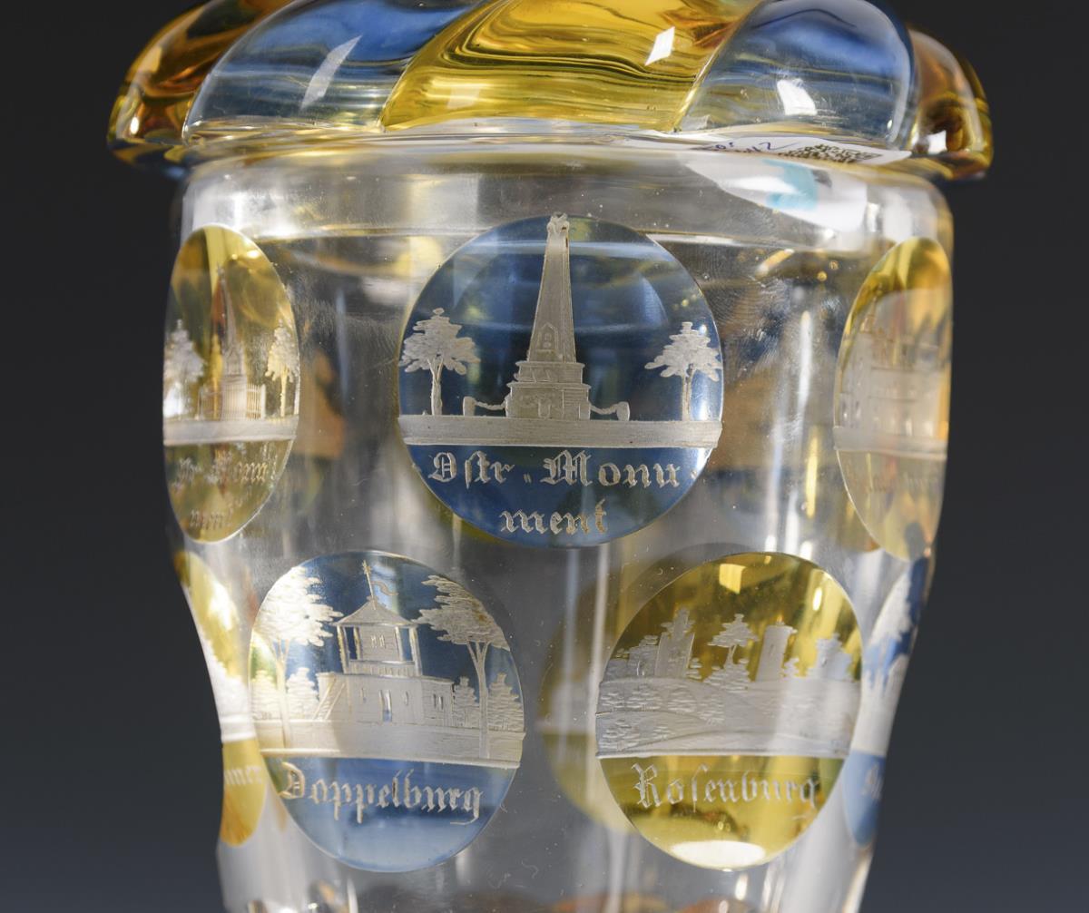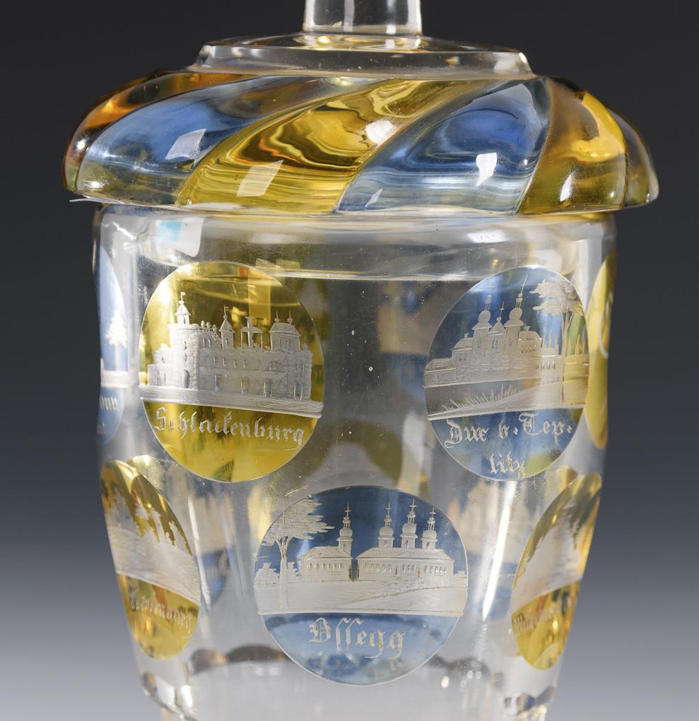 Bell-shaped cup with multi-pass stand and lid with curved godron cut rim and knob. On the body twelve cut lenses with eleven engraved views (including Mariaschein, Wilhelmshöh, Dux, Rosenburg, Schlackenburg) and the dated monogram "C. B. 1835". Chips on the rim of the lid.