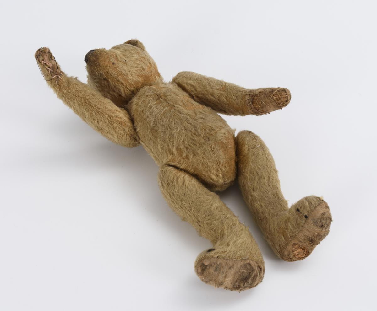 2 bright teddies. 1x with shoebutton eyes, 1x younger with intact voice (probably Hermann). The older one with bald spots and defective paws.