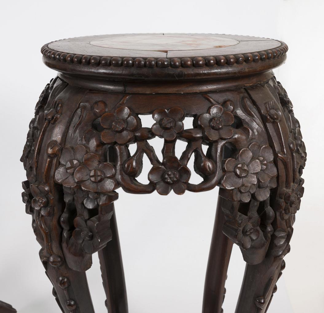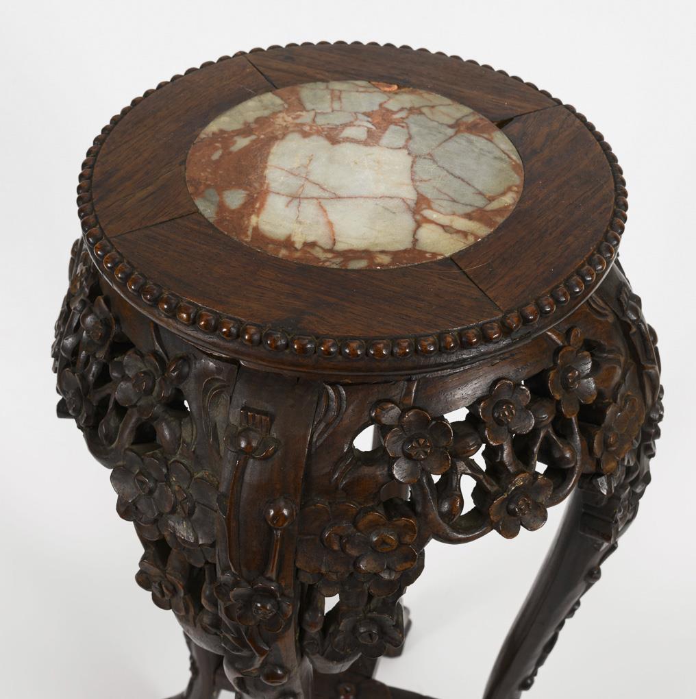 Carved and openwork frame with prunus flowers This motif also on the outer surfaces of the curved legs and the lower cross. Inlaid marble top. Small breakout in marble top and its wooden frame.