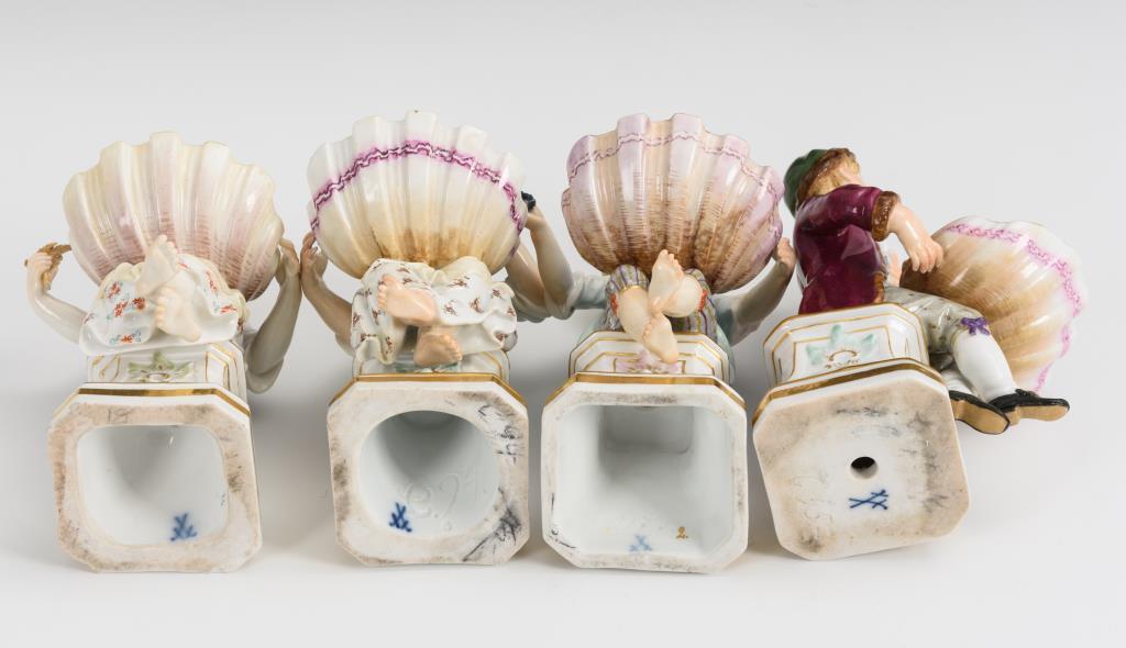 Auf einem Sockel sitzende, eine Muschelschale haltende Kinder als Allegorien der Jahreszeiten. Restaurierungen und wenige Bestoßungen.