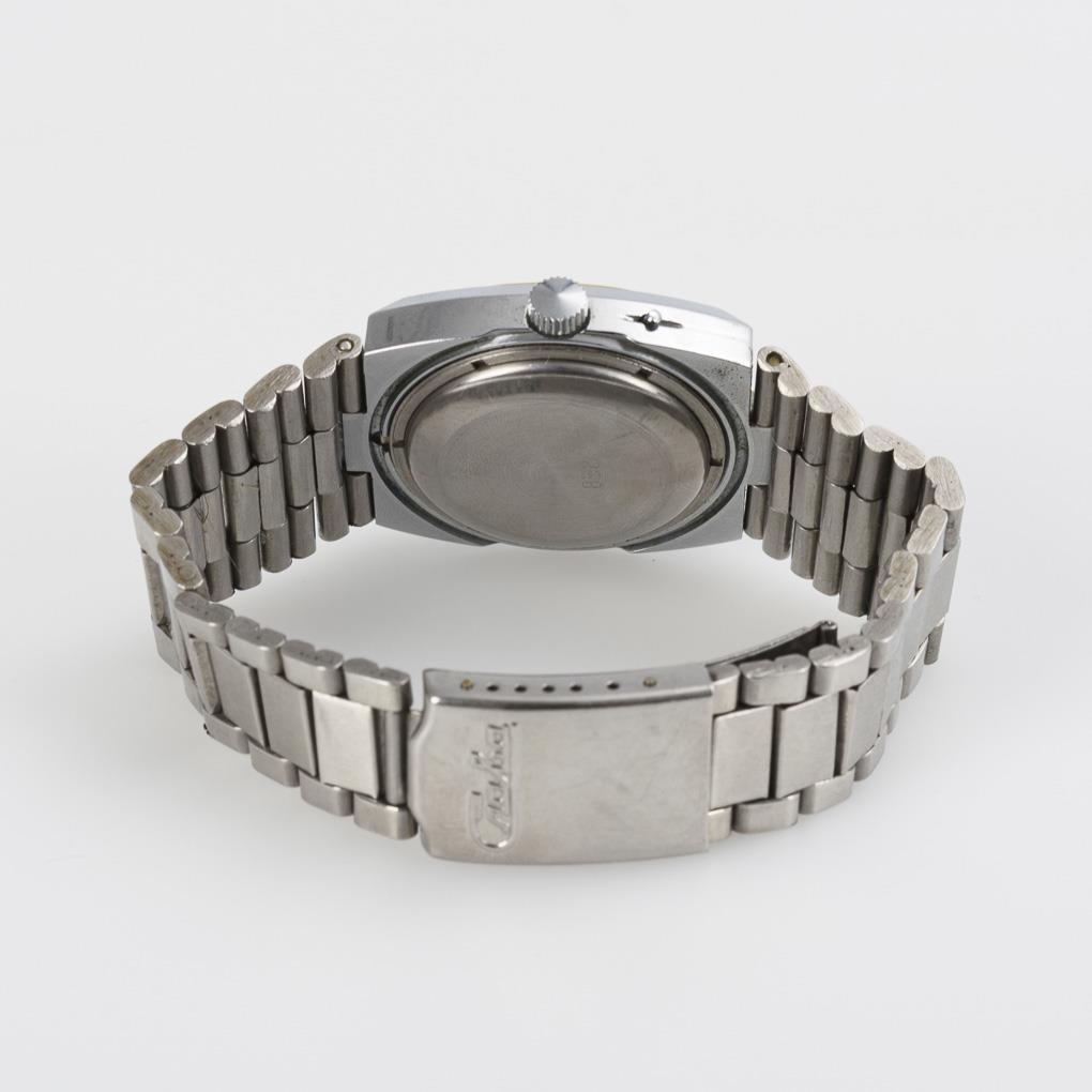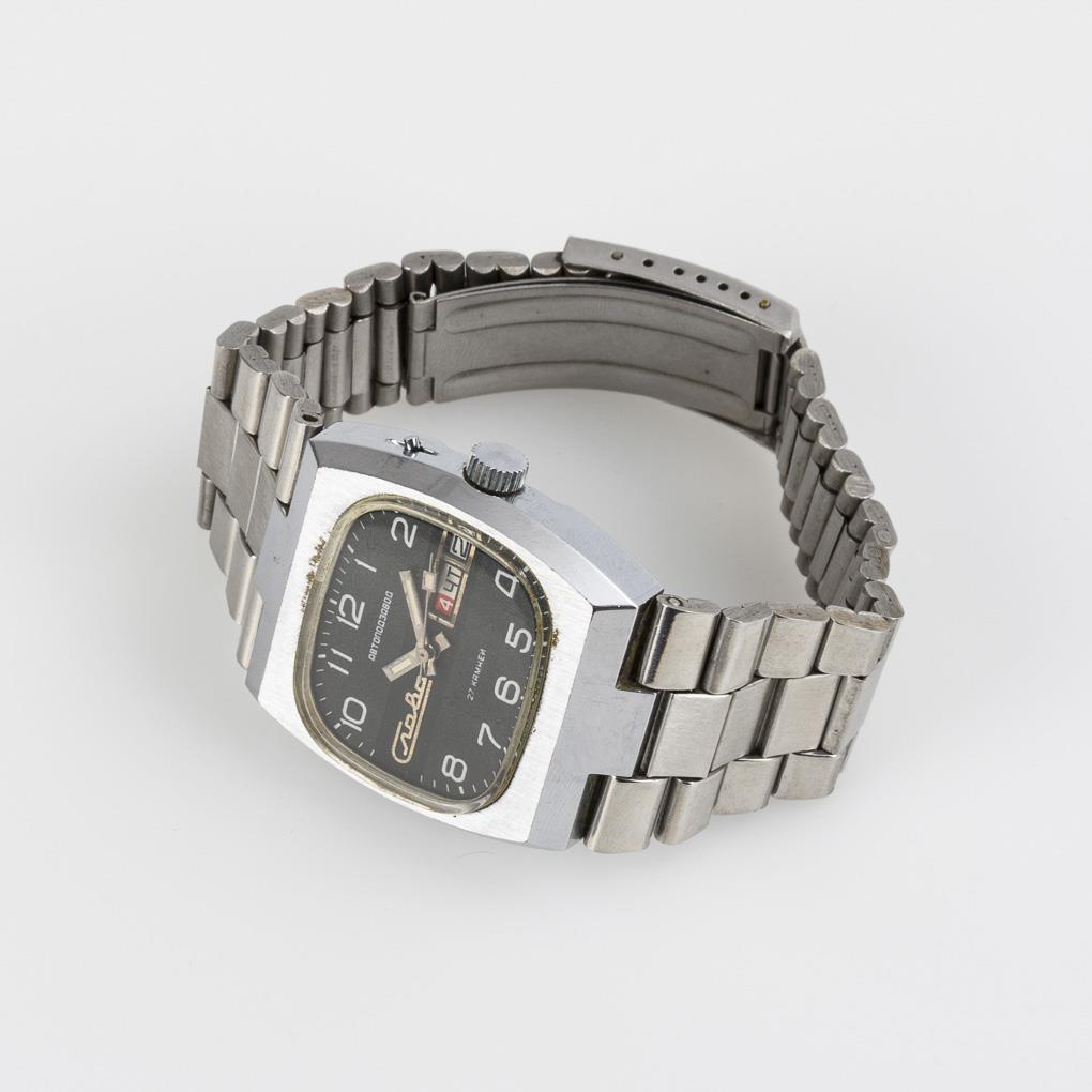 Automatic movement caliber Slava 2427 with double barrel, setting crown, running. Black dial with Arabic numerals, minute crown, central seconds, luminous hands, Russian day of the week indicator, date display with quickset by separate setting knob at the 2nd position