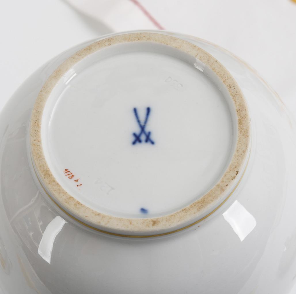 16 parts. Form "New Cutout". Mocha pot (h 21 cm), milk jug, sugar bowl, 6 mocha cups, 6 saucers and 1 four-pass bowl (l 19 cm). Matching hand-embroidered tablecloth with Yellow Dragon motif.