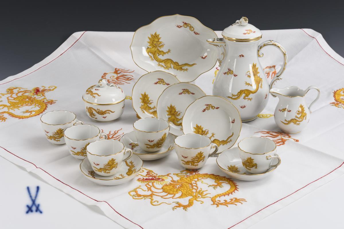Mocha service "Yellow Dragon" and tablecloth with dragon embroidery. Meissen.