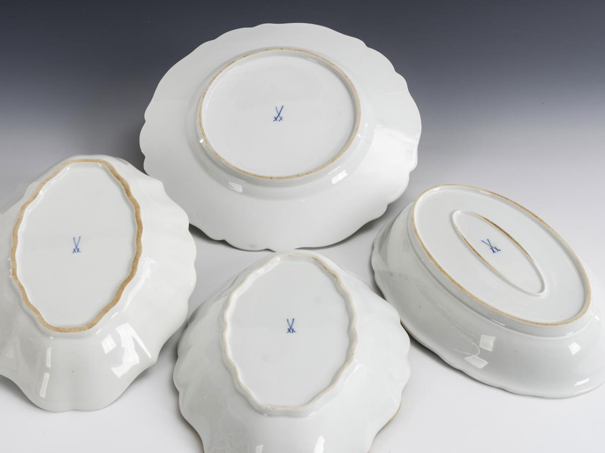 1 oval dish and 2 oval dishes with matching flag (L ca. 26 cm). / 1 dinner plate in the form "Old cutout" (Ø 27 cm).