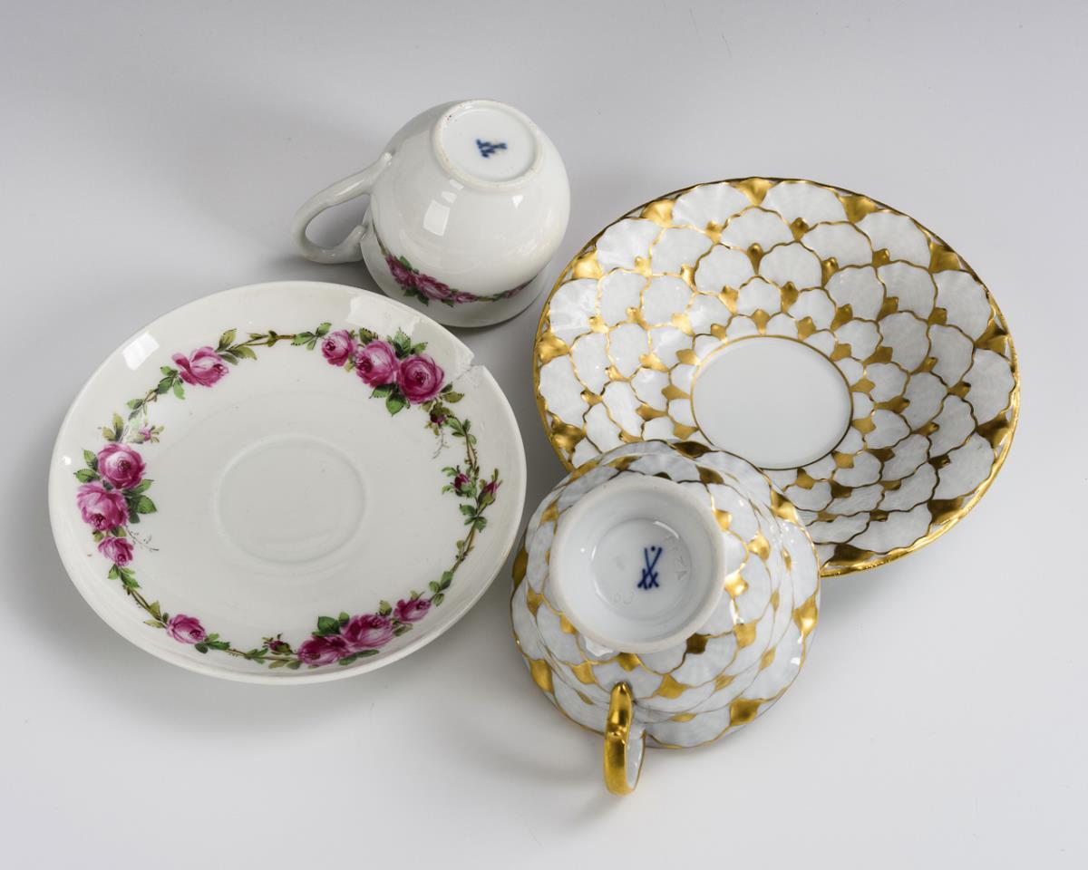 1x cup with swan handle and surrounding polychrome painted rose band. / 1x bell cup with gold-staffierte shell relief. 1 saucer with rim bump.