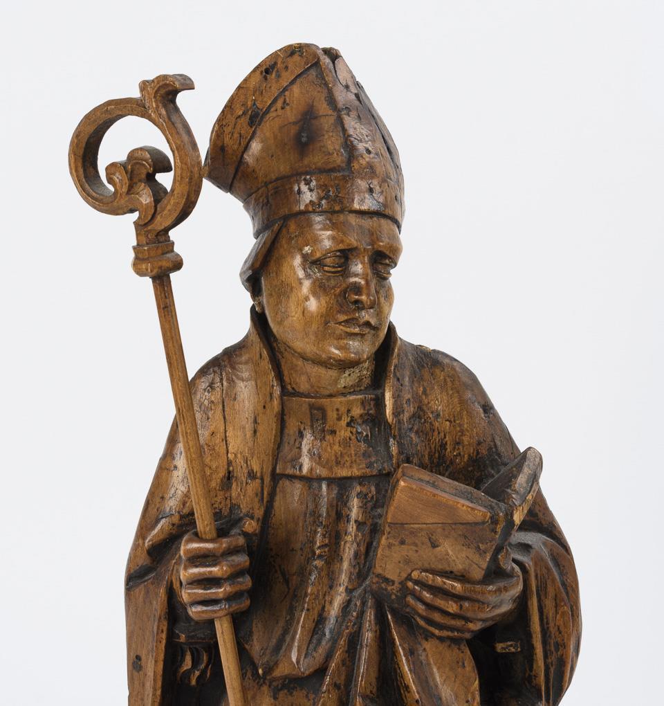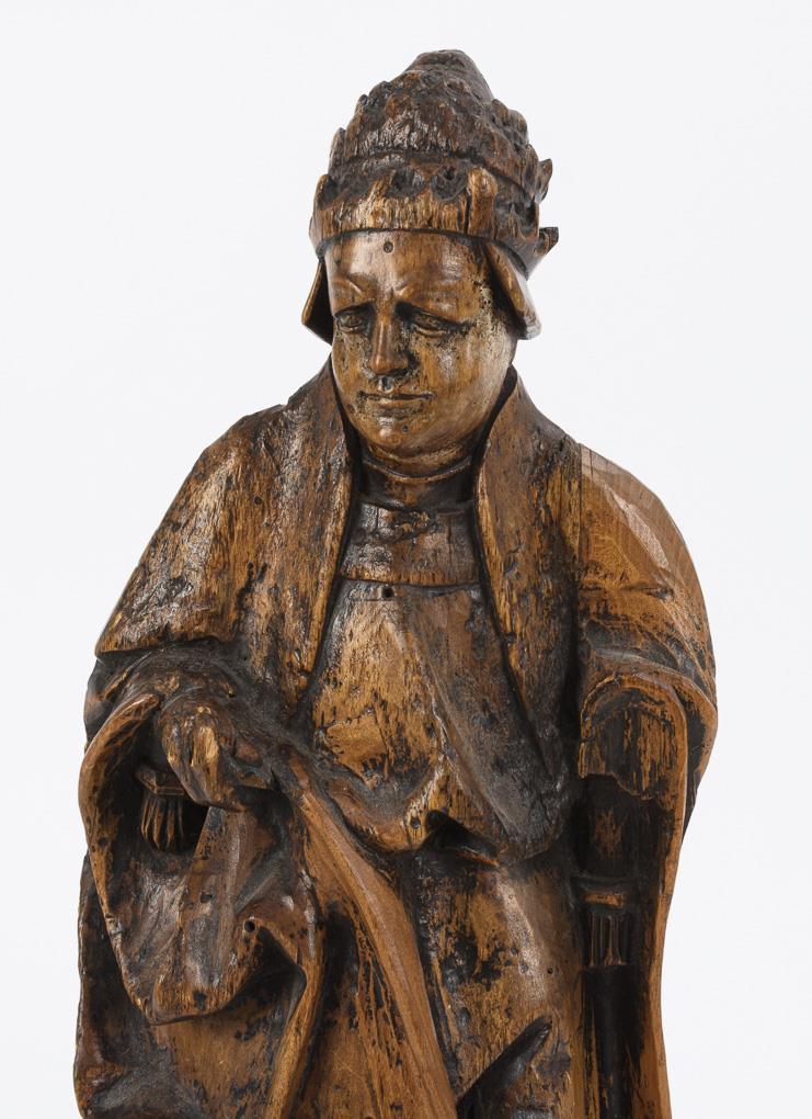 Probably from an altar standing figures of a pope or a bishop with book and staff. 1 hand missing, each additions, anobia traces, few dry cracks, signs of age and use.