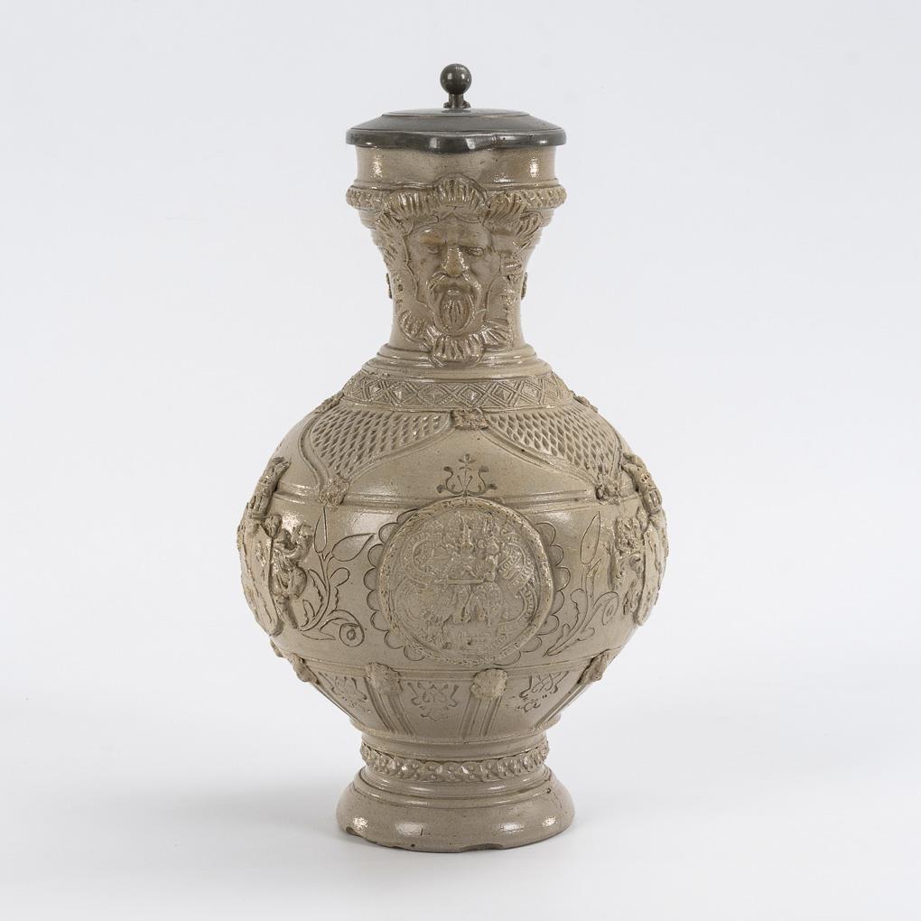 Sphere-bellied vessel with narrow neck, round foot and ribbon handle with rolled lug, flat pewter lid with ball pusher. Circumferential incised, stamped and overlay decoration with coats of arms, rosettes, lion mascarons and a bearded mask. Slightly bumped on the stand.