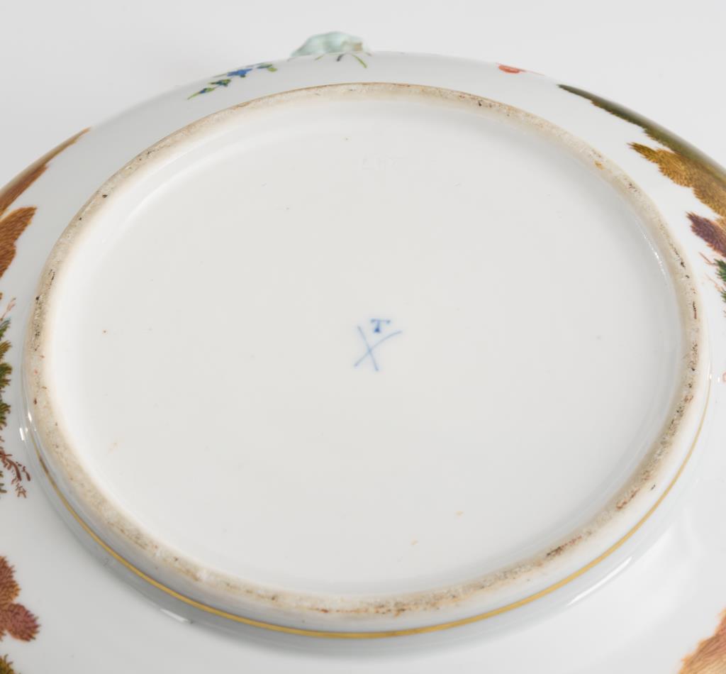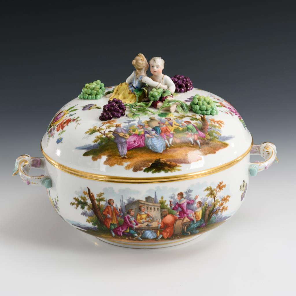 Terrine mit Rocaillehenkeln sowie einem Deckel mit Kinderpaar mit Trauben als Knauf. Aufwändig bemalt mit figurenreichen Parklandschaften. 4 Weinblätter bestoßen.