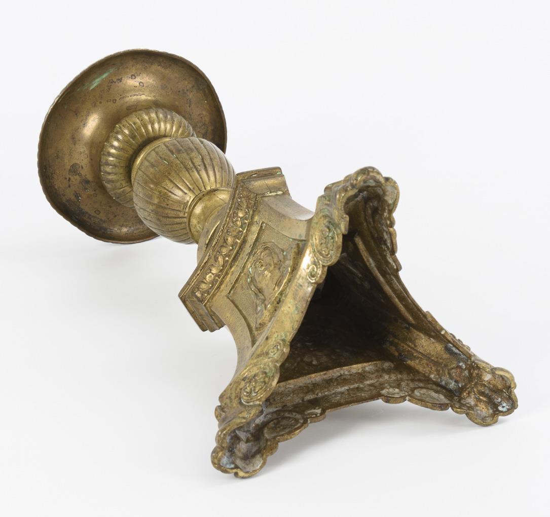 Candlestick with reliefs on 3-sided base: Sacred Heart, Mary, Trinity triangle. Above the vase shaft of the wax plate with threaded screw as a thorn. Missing parts, some signs of age/use.