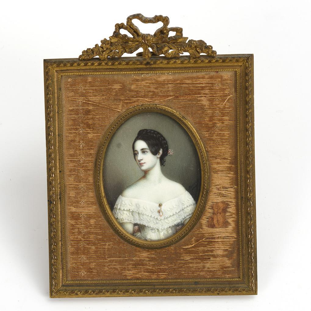 Glazed gouache, brass frame covered with fabric and bow finial. 6.5 x 5 cm, frame 14 x 10 cm.