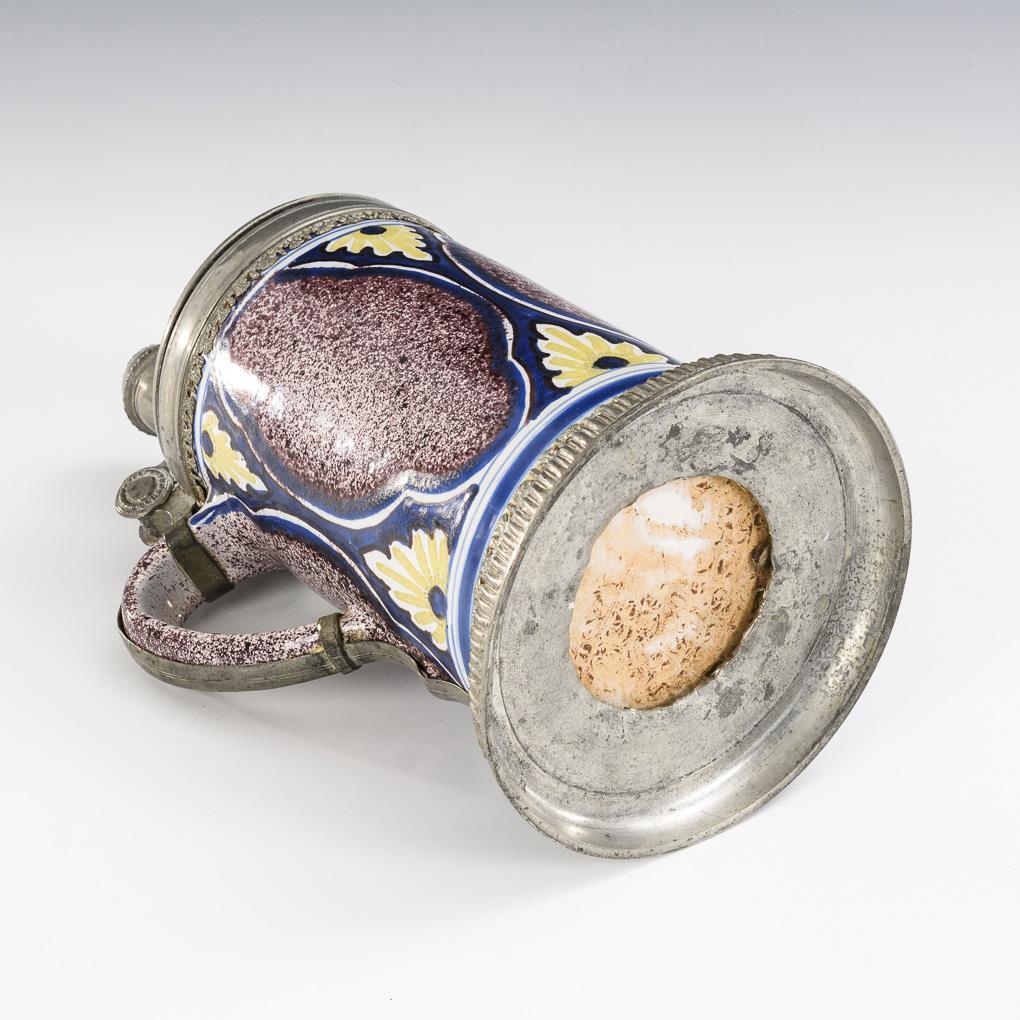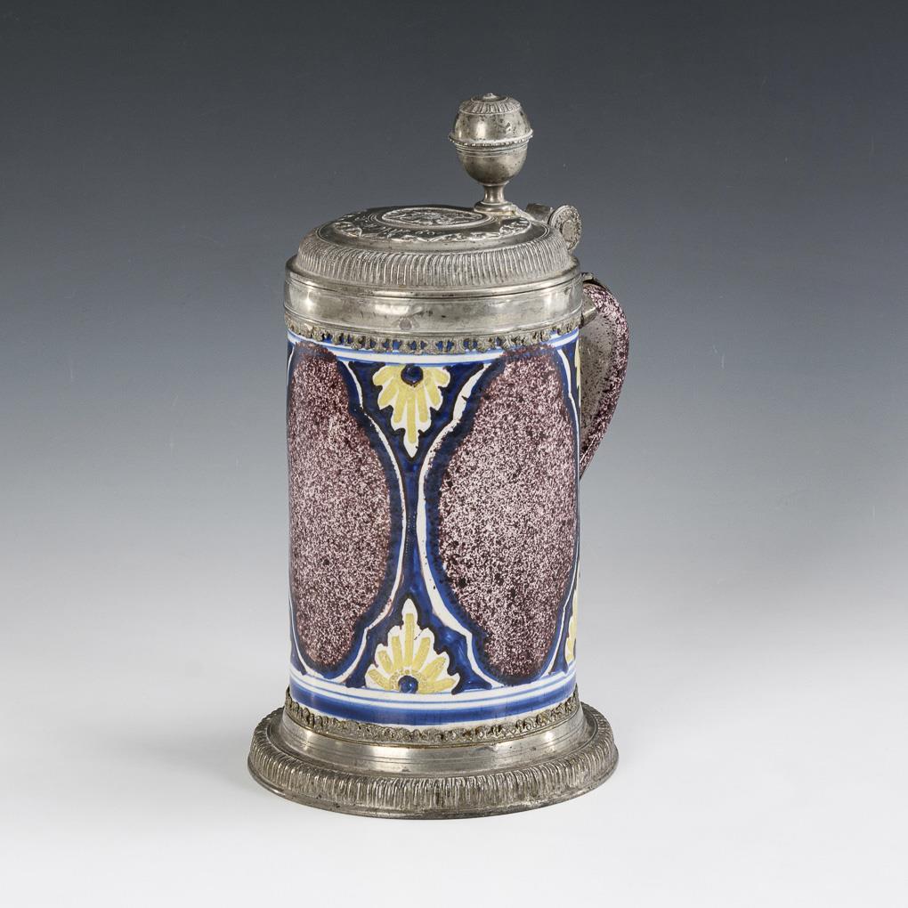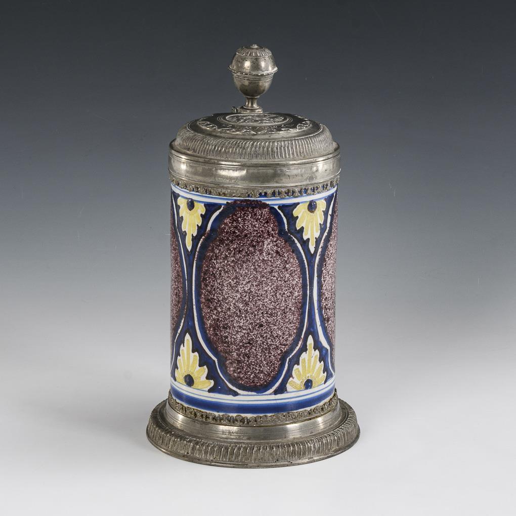 Cylindrical shape with ribbon handle and rich pewter mount. Profiled lid with ball pusher, relief plaque with putti, engraved "MMW 1760", handle band, pewter stand. Slight signs of age and use, minimal glaze cracking in places.