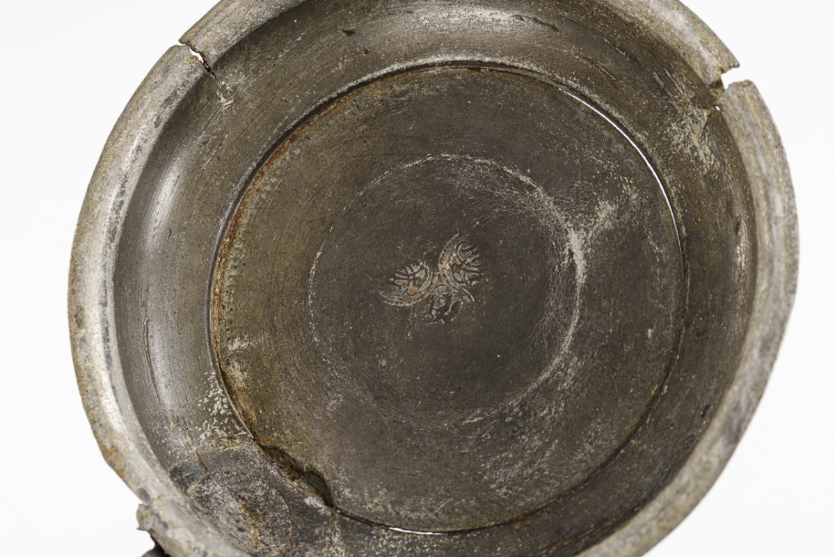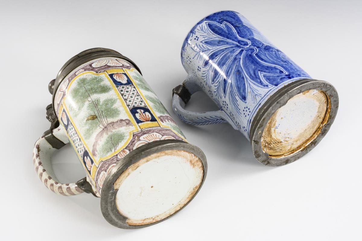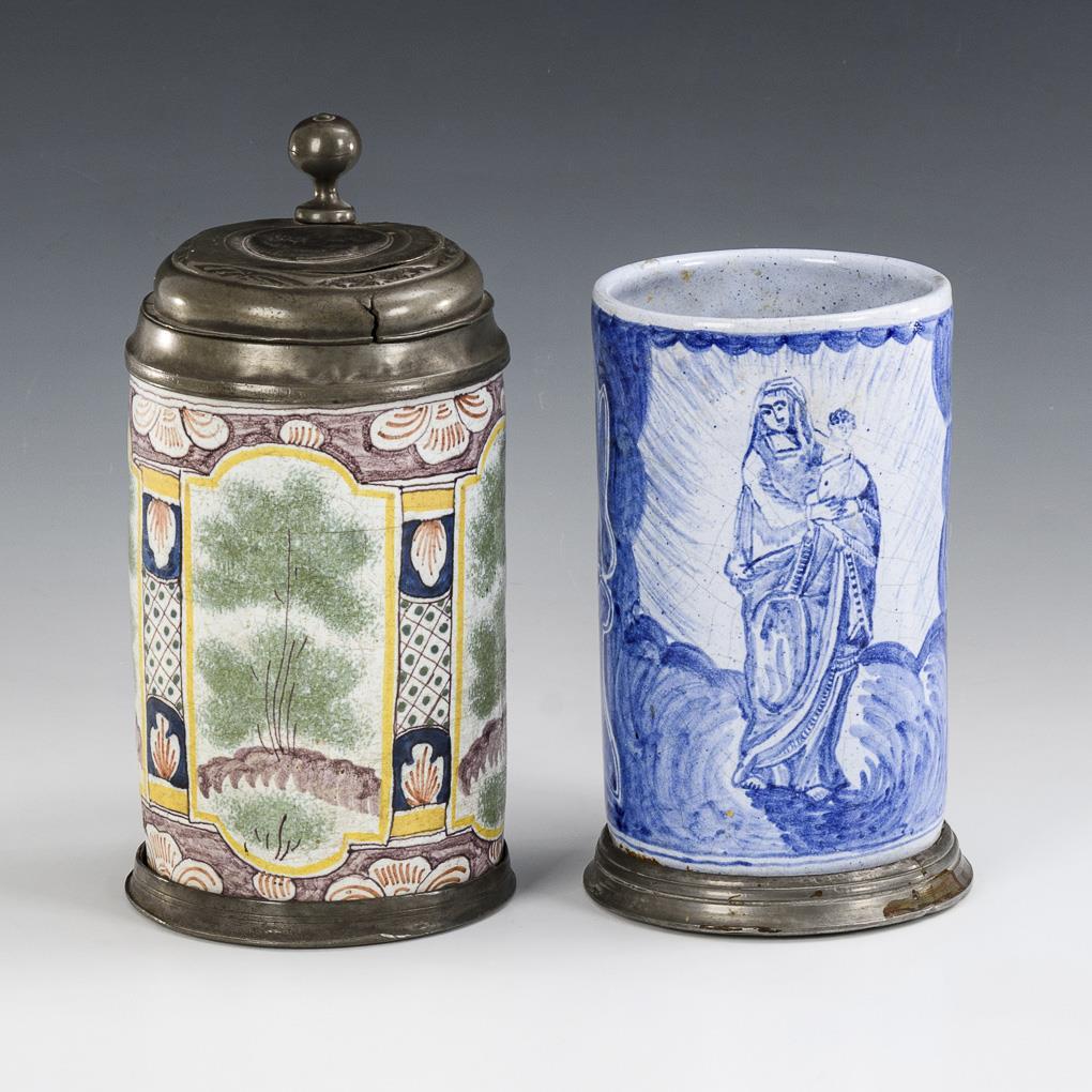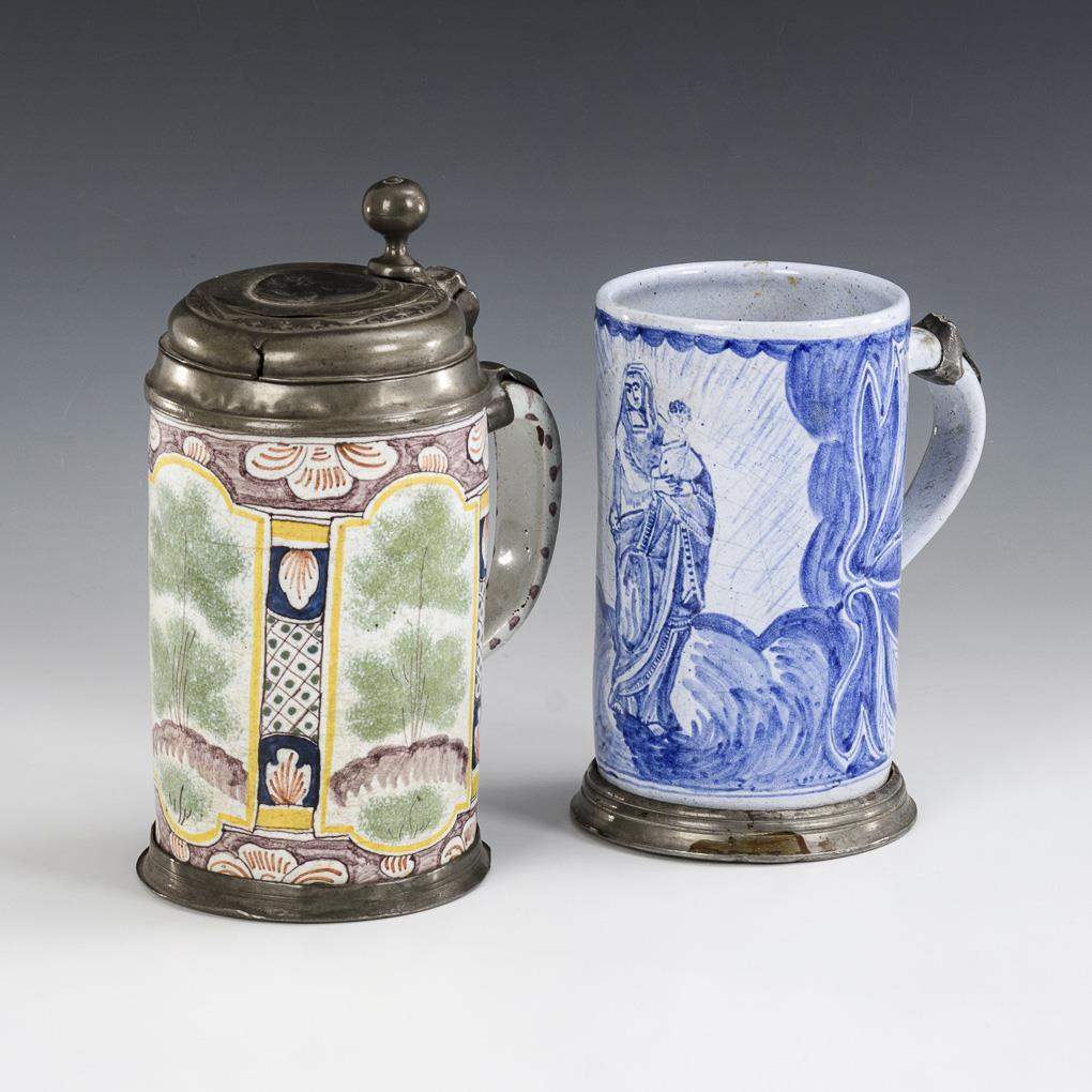Thuringian pilaster jug with colored tree painting, unmarked, engraved pewter lid and pewter stand ring (h 23 cm). Nuremberg cylindrical jug with Madonna and Child in blue painting, brush mark K, loose pewter stand ring (h 18,5 cm). With defects.