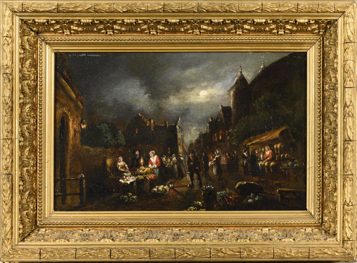 Many people between the greengrocers in the bright glow of candles and the full moon.