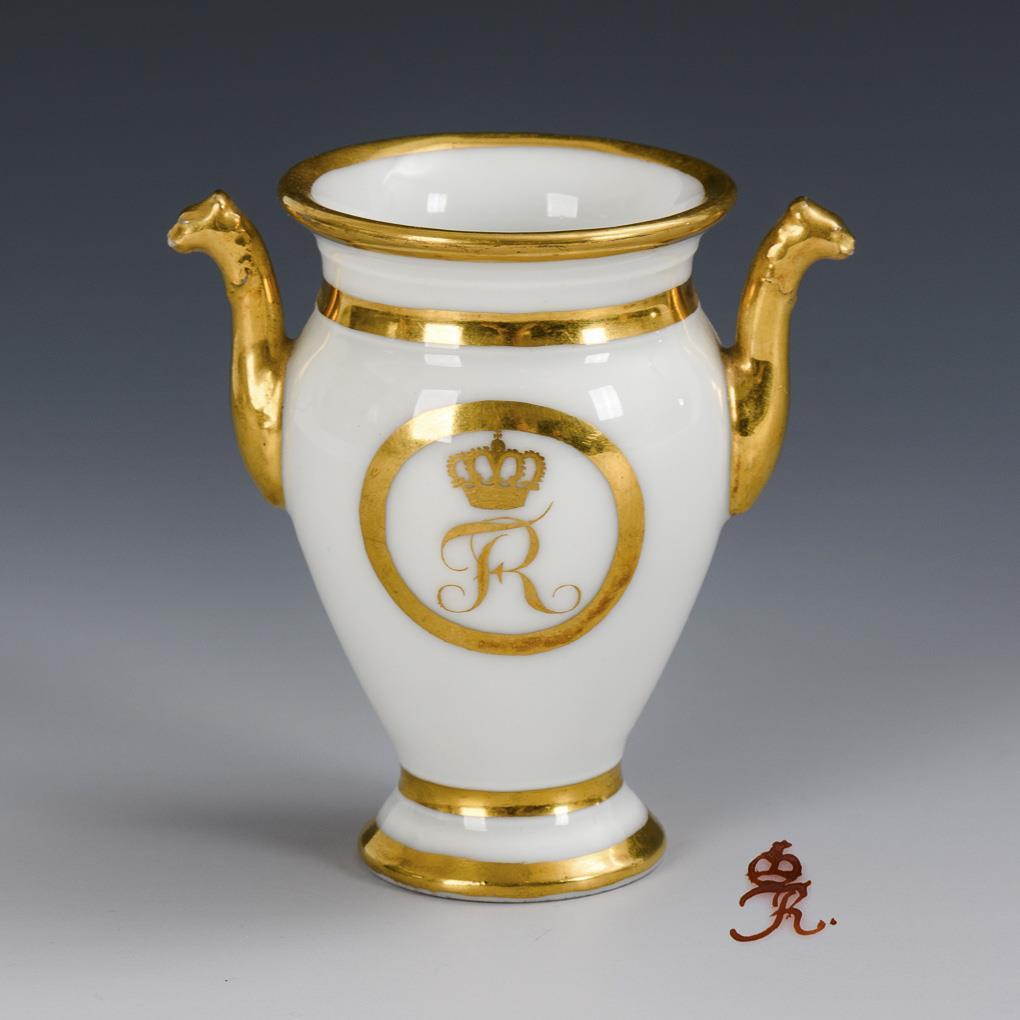 Vase-shaped vessel with two animal head handles. On both sides a medallion with the monogram "FR" (= Friedericus Rex) under a gold engraved crown.