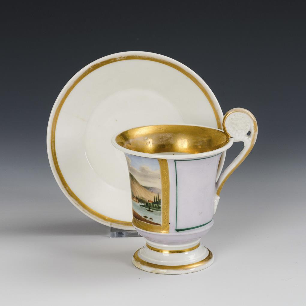 Footed crater cup with lion head cookie handle. On the front a gold-framed rectangular cartouche with the inscribed view of Bad Ems with the Karlsburg castle located on the banks of the Lahn. Gold somewhat rubbed, hairline crack in the handle.