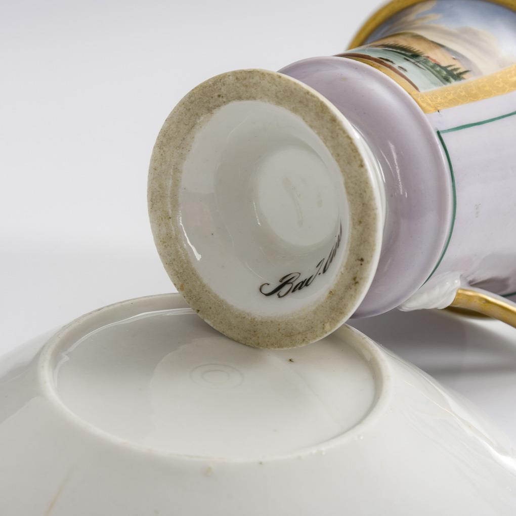 Polychrome painted, gold decorated. H cup 10.5 cm, Ø supplemented saucer 13 cm.