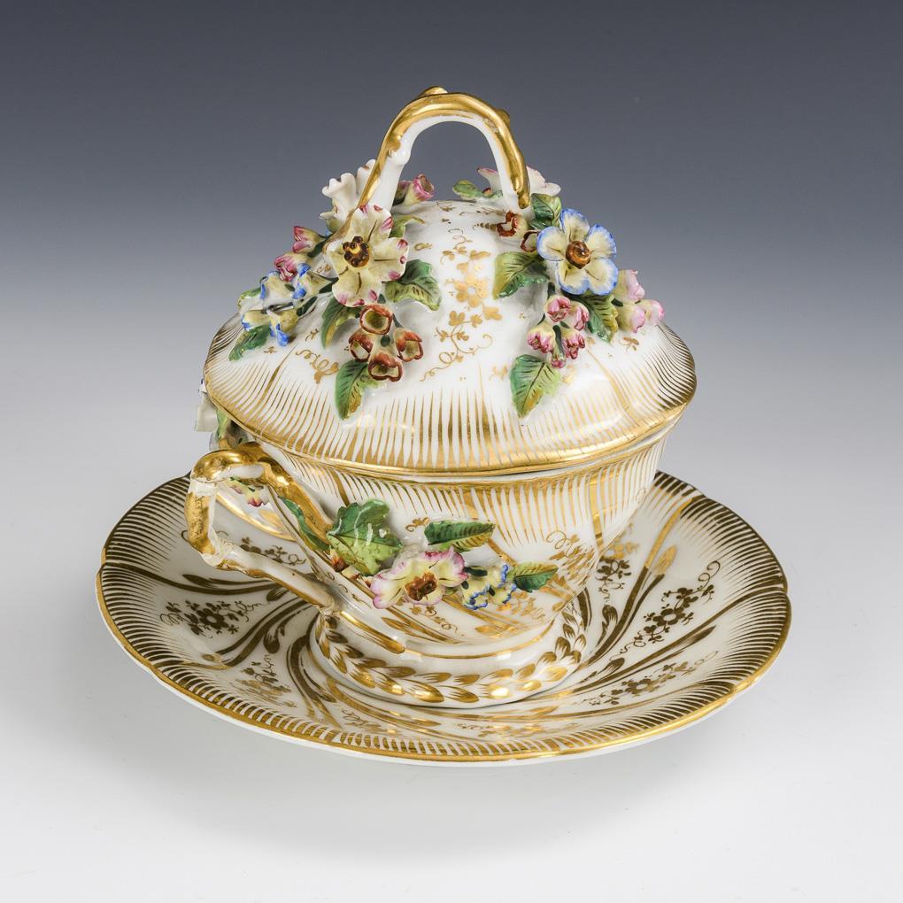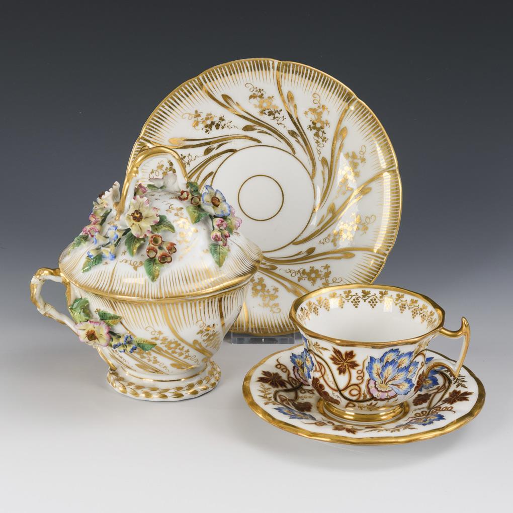 1x footed bell cup with curved godronized wall, branch handle ending in flowers and lid with branch handle and flower overlay. Floral gold painting (H cup 15.5 cm, Ø original saucer 18 cm.) / 1x footed, polygonal bell cup with pointed curved handle and vine decoration (H cup 6 cm, Ø original saucer 14.5 cm). 1x handle defective, bumps on the flowers.