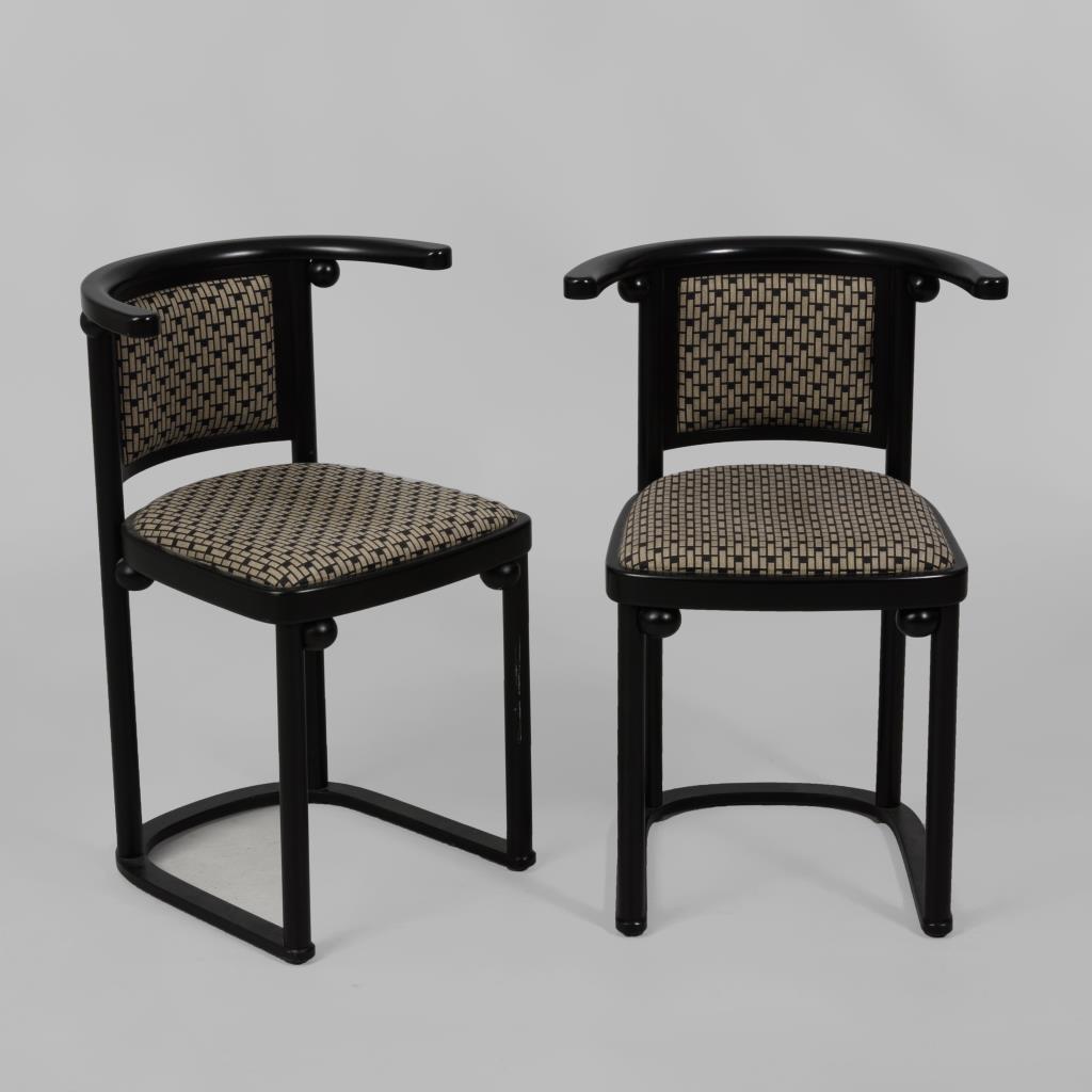 Paar Lehnstühle im Design-Jugendstil, entworfen von Josef Hoffmann für das "Cabaret Fledermaus" in Wien, Bezug mit stiltypischen Ornamenten. Leichte Gebrauchsspuren.