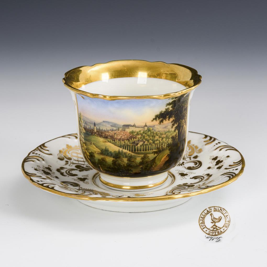Footed bell cup with rocaille fess. On the front a gold-framed cartouche with the bottom marked view of the city of Gotha.