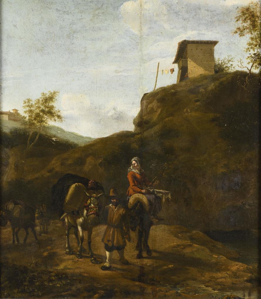 Panel painting with travelers on horseback