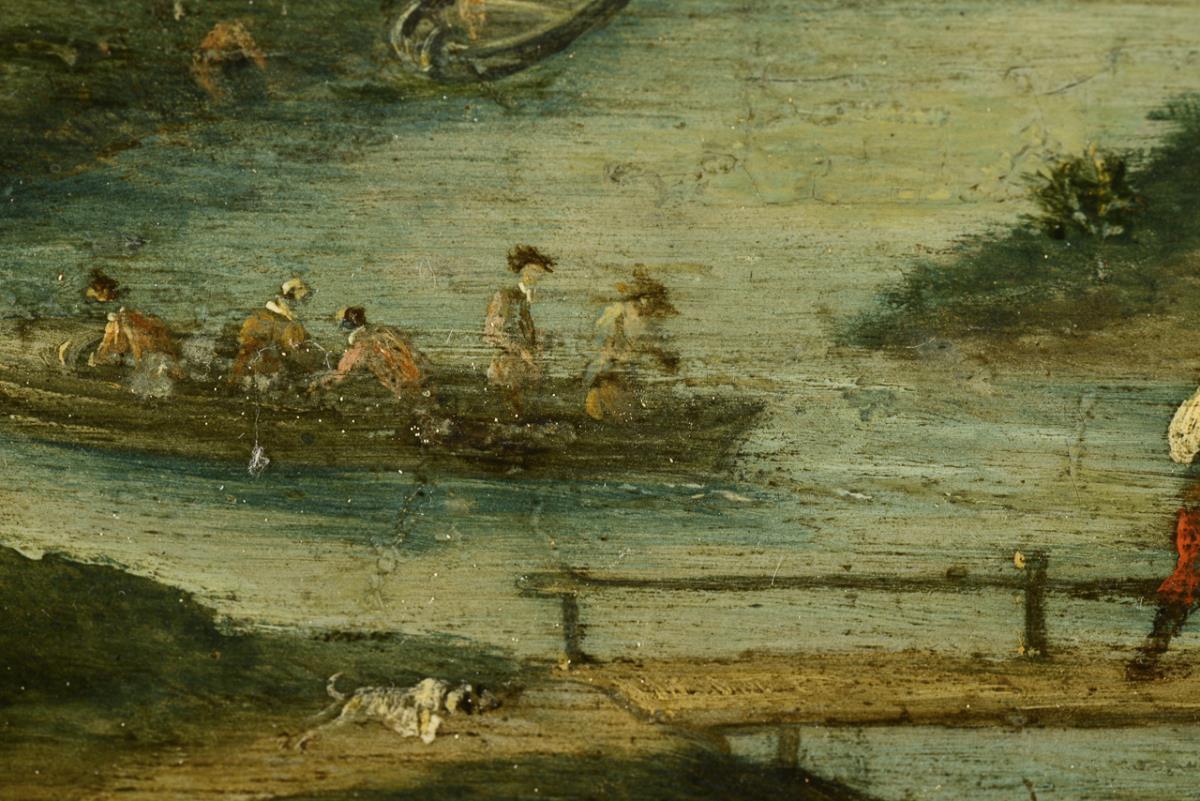 Reminding the many-figure city painting Brueghel with riders on the street talking to the townspeople near the river on a sunny day. Restored.
