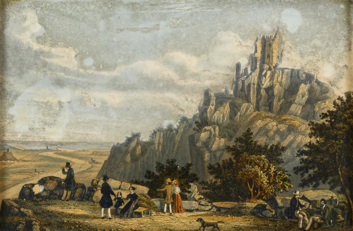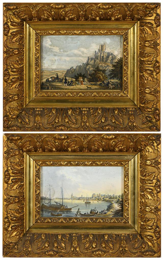2 finely colored views - Indistinctly signed: city on the water with boats and staffage figures | landscape with rocky mountain and castle ruins, in the foreground staffage figures; each in decorative frame. Each foxing, soiled.
