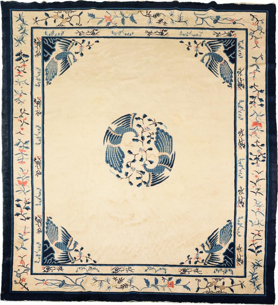 Offener Fond mit zentralem chinesischen Medaillon und korrespondierender Zwickelgestaltung, Bordürenstreifen mit Blütenzweigen. Reinigungsbedürftig, teils leicht verwaschen.