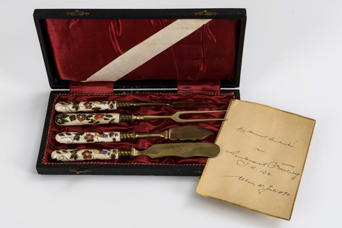 2 serving forks, 1 butter knife and 1 fish knife: with brass tines or blades and porcelain handle with polychrome painted bird pattern. With black case, inside a card inscribed "A small souvenir of Lieutenant Bresling J. R. 124th / Ulm, July 10, 1894". 1 handle restored.