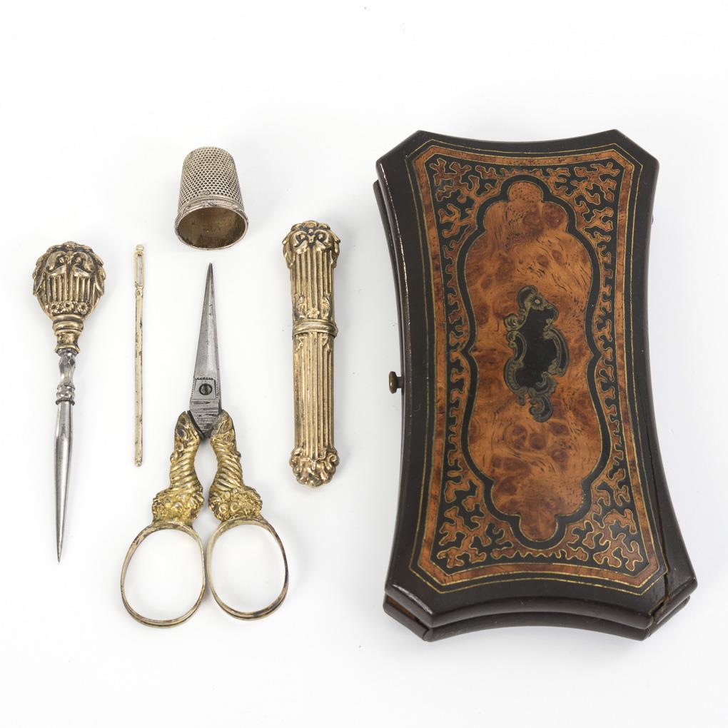 Oblong wooden case with brass thread inlays on the boulle-like marquetry on the hinged lid. Inside needle case, thimble and probably supplemented scissors and thimble. Dry cracks in wooden base, lid needle case cracked, scissors/thimble supplemented, some signs of age/use.