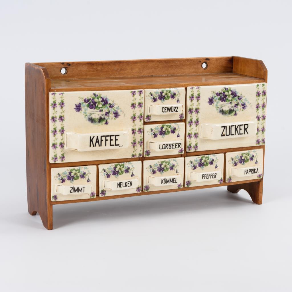 Buchenholzregal und 9 bezeichnete Keramikeinsätze mit weiß-lila Veilchendekor. Leichte Alters- und Gebrauchsspuren.