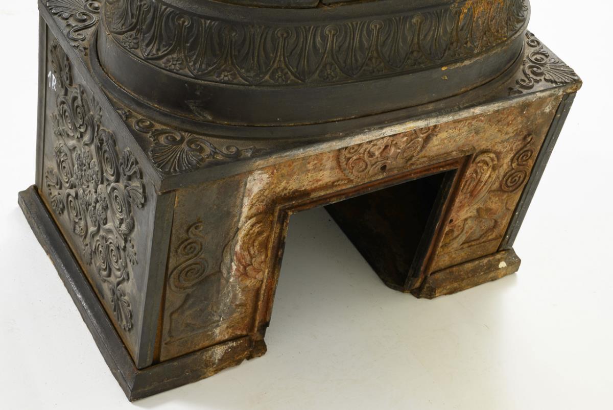 Representative oval tiered stove with cooking and warming chamber on box-shaped base with rear opening for fuel, with composite piece for stove pipe; decorated with lush, antique relief ornamentation. Traces of age/use, traces of corrosion.