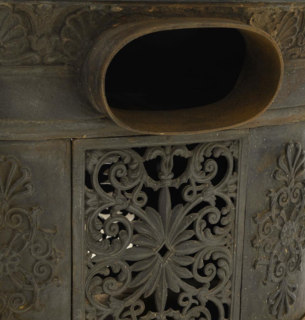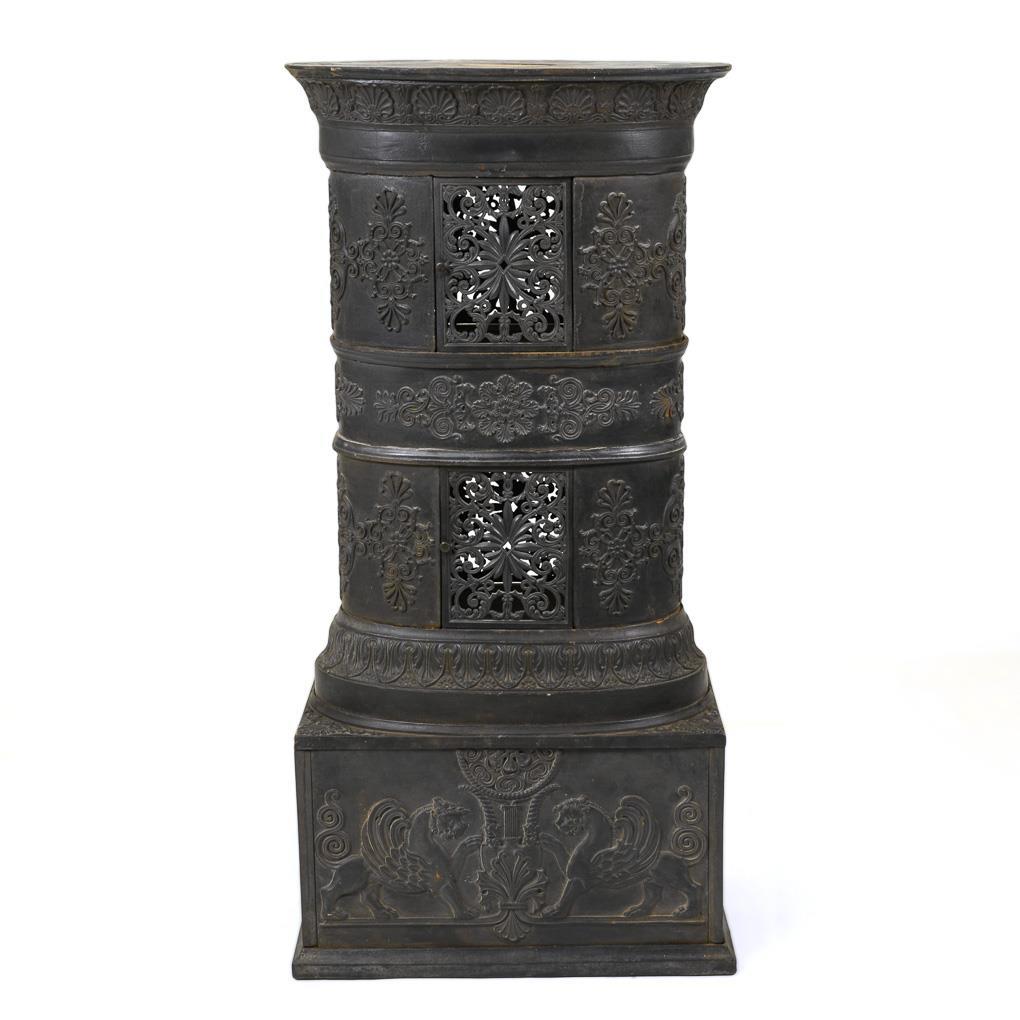 Representative oval tiered stove with cooking and warming chamber on box-shaped base with rear opening for fuel, with composite piece for stove pipe; decorated with lush, antique relief ornamentation. Traces of age/use, traces of corrosion.