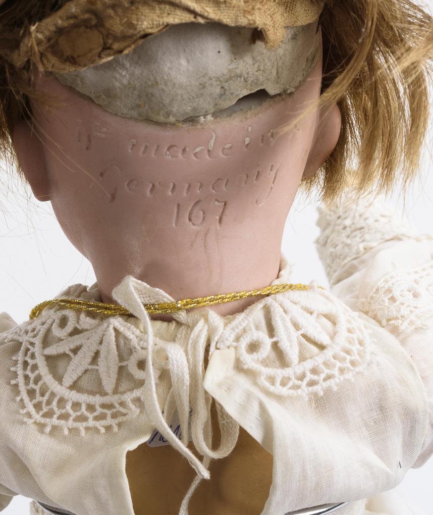 Both with crank head, blue eyes, real hair wig and 15-piece limb body. 1x brown dress, 1x white dress. 1x with hairline crack spider on forehead, 1x with body painted over.