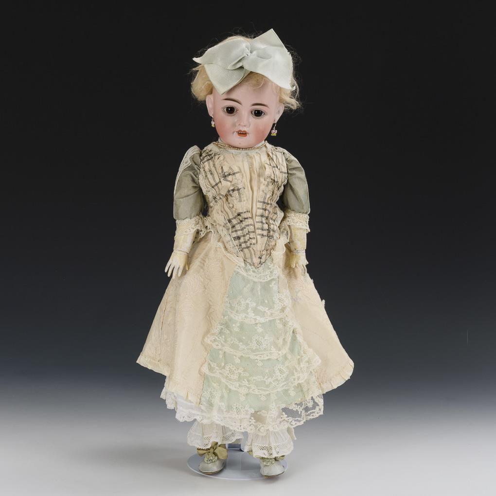Crank head, fixed brown eyes, earrings, blond mohair wig. Brightly painted, 11-piece limb body. Green and white dress, bright cloth shoes. Head x-rayed: without defects. Body with signs of age and glue spots, 2 fingers missing.
