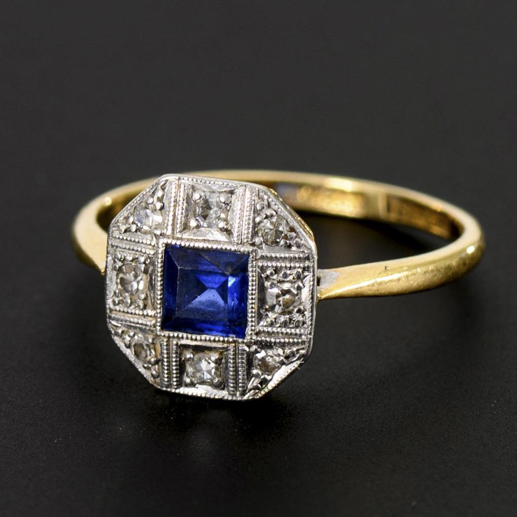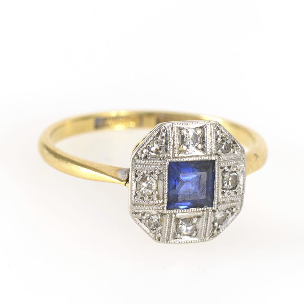 Sapphire carré surrounded by 8 small inset diamonds between narrow rail.