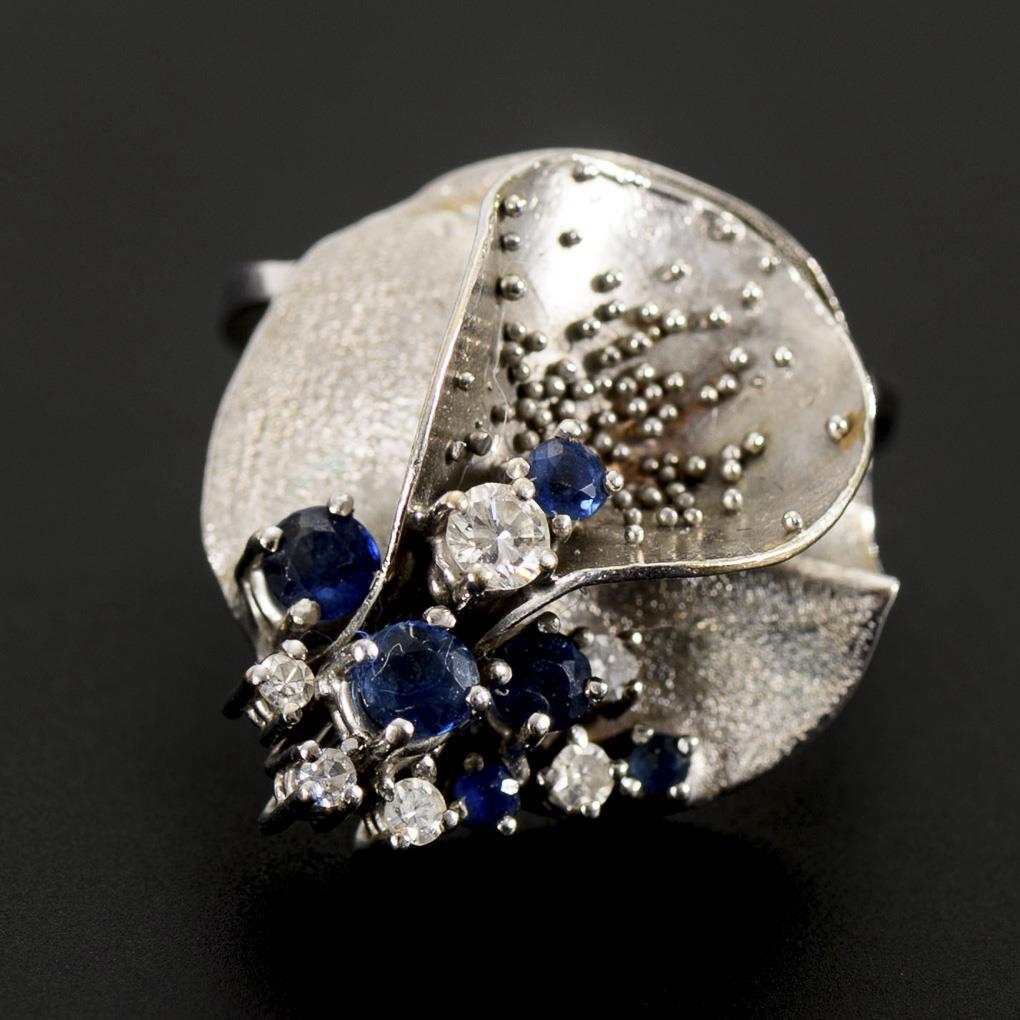 Sculpturally designed, granaly decorated ring with chaton set brilliant, 6 small sapphires and 5 diamonds. Narrow rail.
