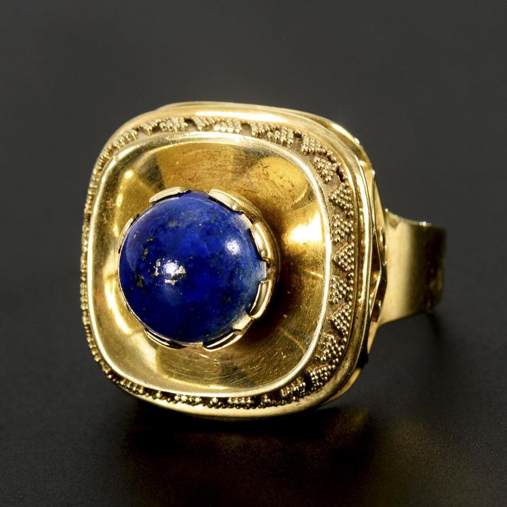 Designer ring with lapis lazuli and granules.