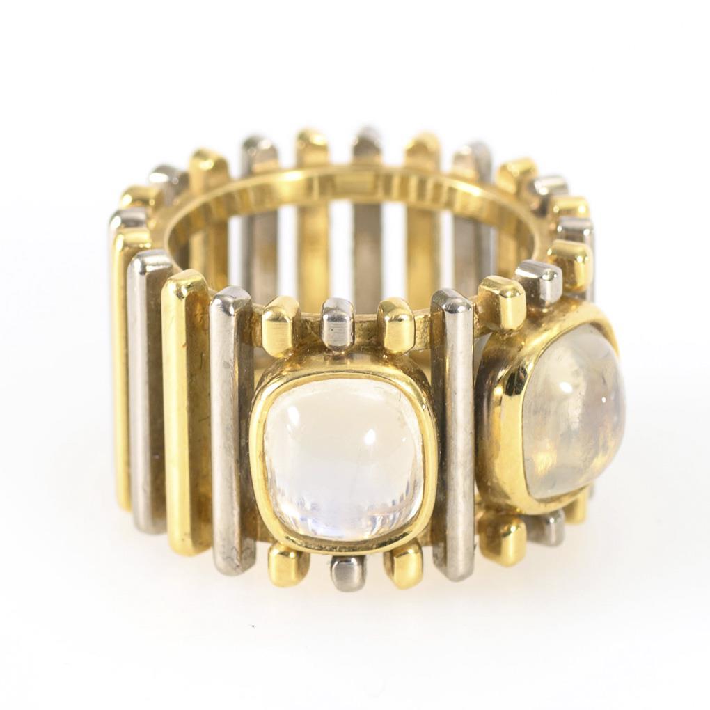 2 bar set moonstone cabochons on wide bar decorated band ring .