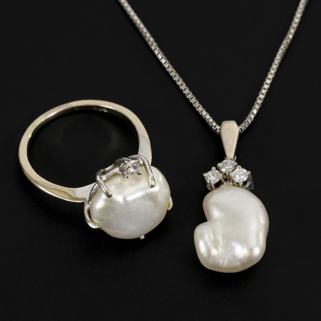 Pendant with baroque pearl and 3 chaton-set diamonds, on Venetian chain with ring spring clasp. Matching ring with baroque pearl and small brilliant-cut diamond. Narrow rail.