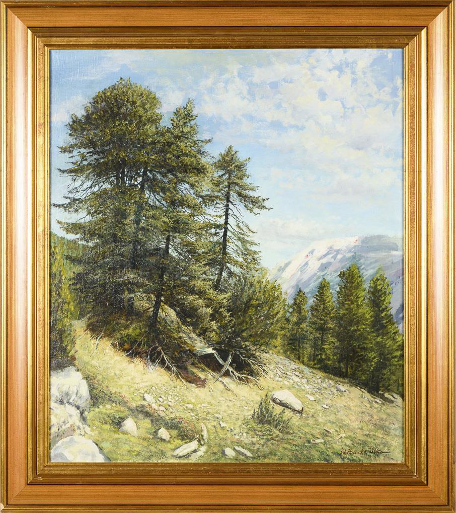 Bright light over the barren slope with the fir trees under slightly cloudy sky.