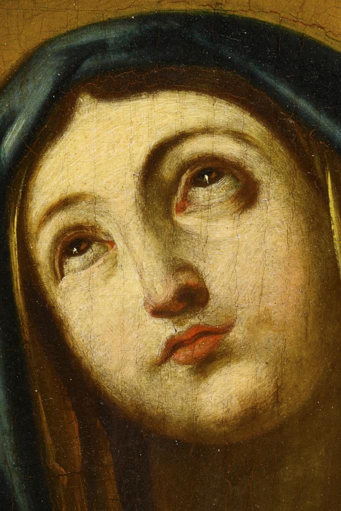 Mary in blue cloak with hands folded over the chest and looking to the sky. Traces of age.
