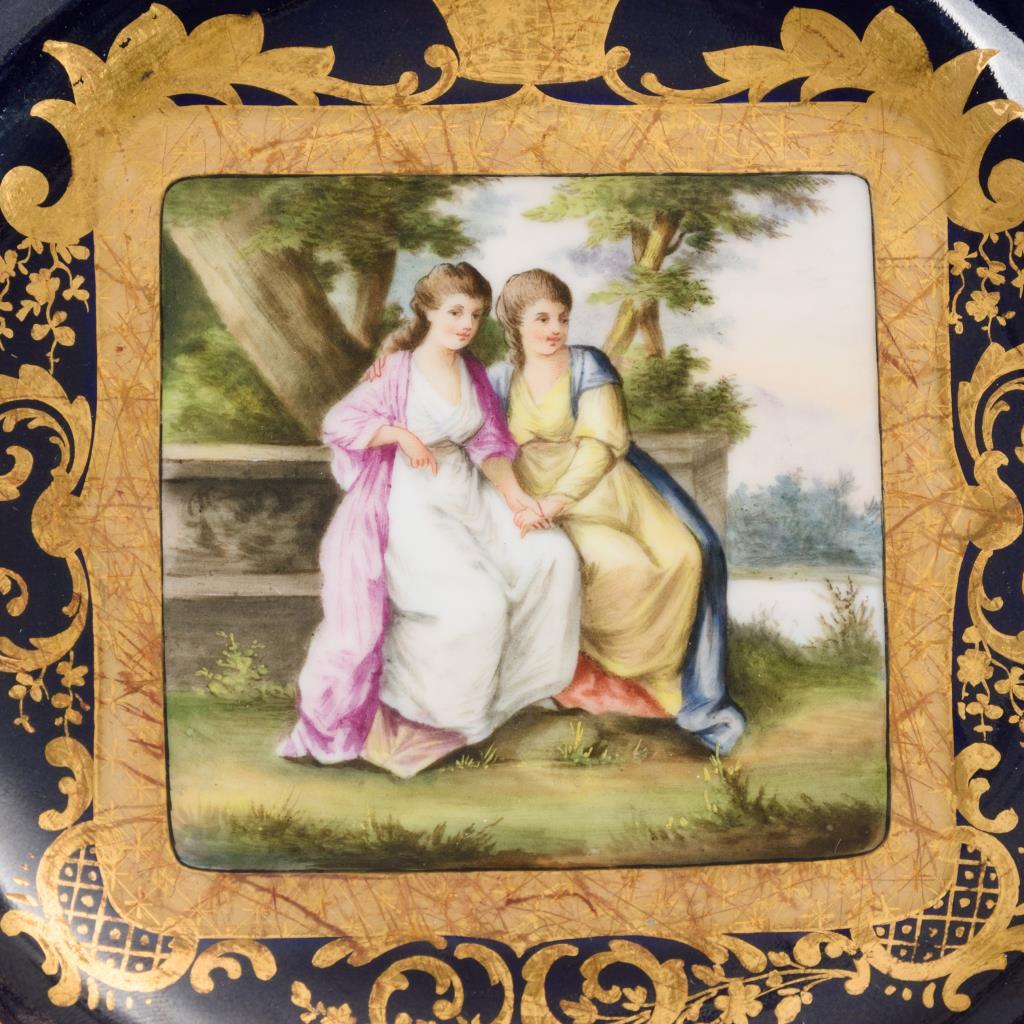 Mehrpassige Teller mit stabdurchbrochener Fahne sowie reicher floraler, teils radierter Goldmalerei auf kobaltblauem Fond, im Spiegel eine Quadratkartusche mit der Darstellung einer figürlichen Szene. Partielle Goldbereibung.