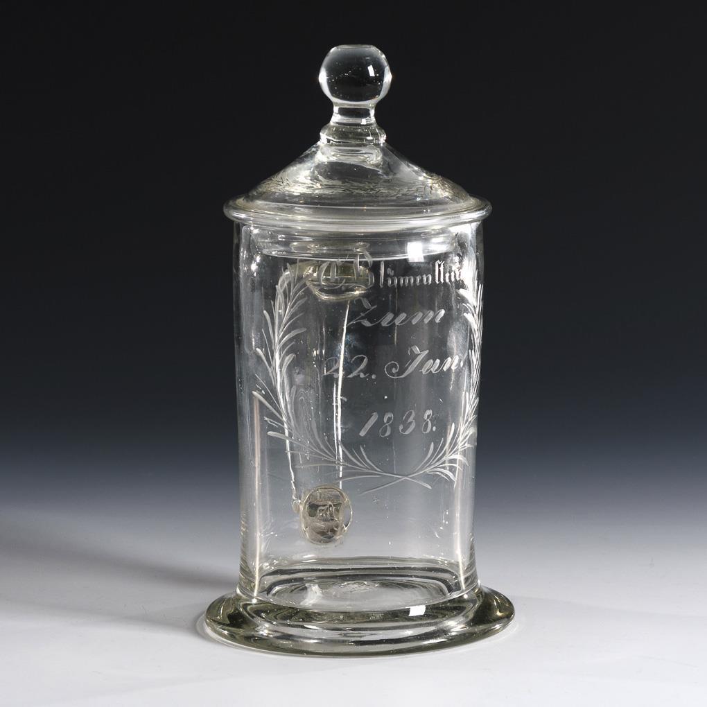 Cylindrical jug with ribbon handle and original knob lid; demolition. On the front the engraved dedication "C. Blümenstein. to 22 Jun. 1838".