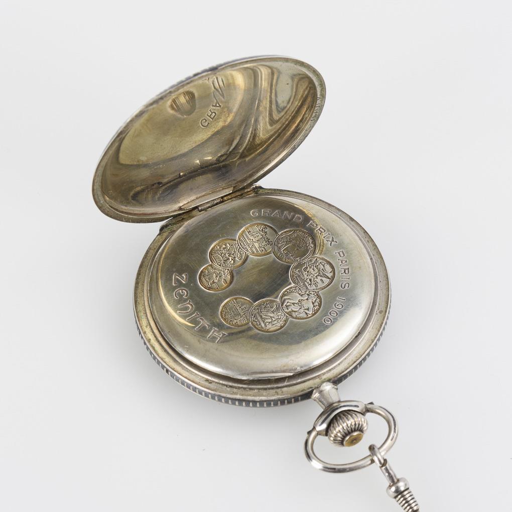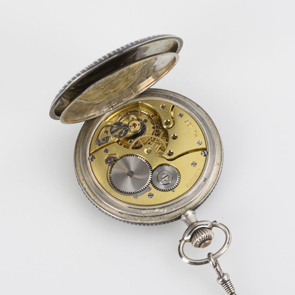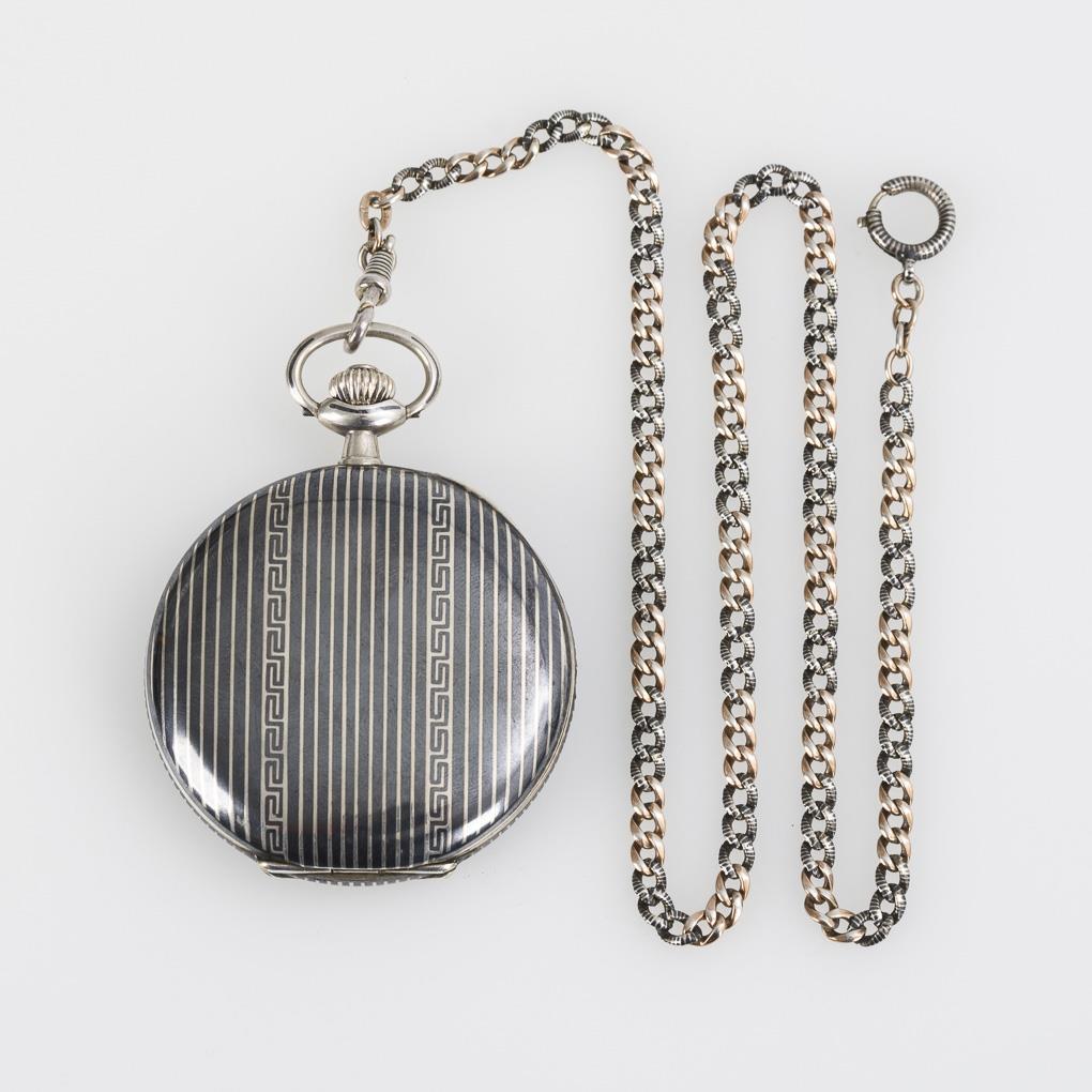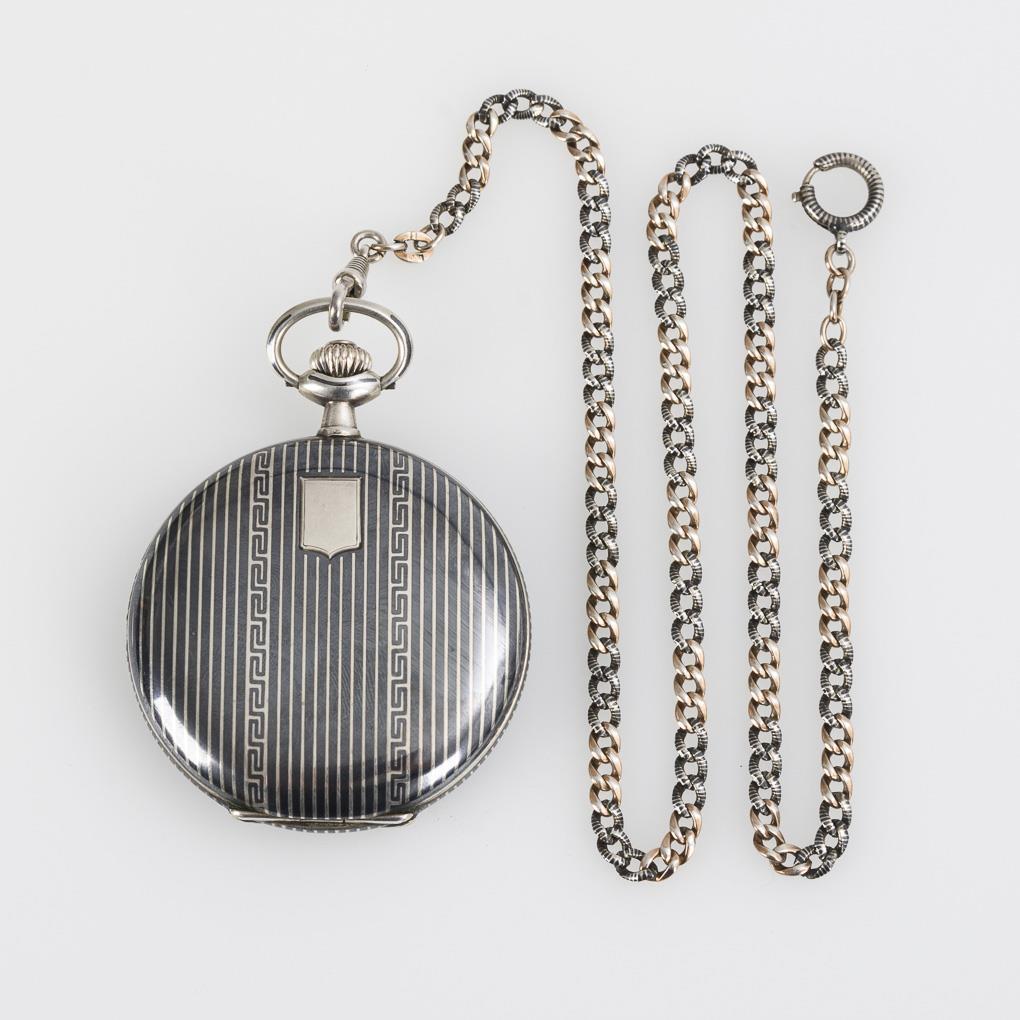 Silver savonette with niello decoration and silver watch chain. Zenith.