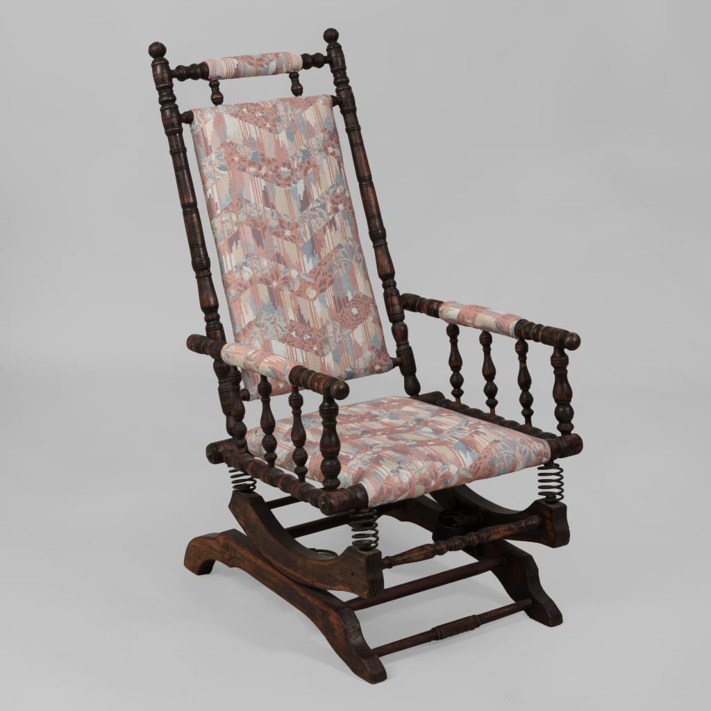 Schaukelstuhl mit Drechselgestell und Wippmechanismus aus Druckfedern; Polster mit floralem Bezug. Restauriert, Polster und Bezug ergänzt.