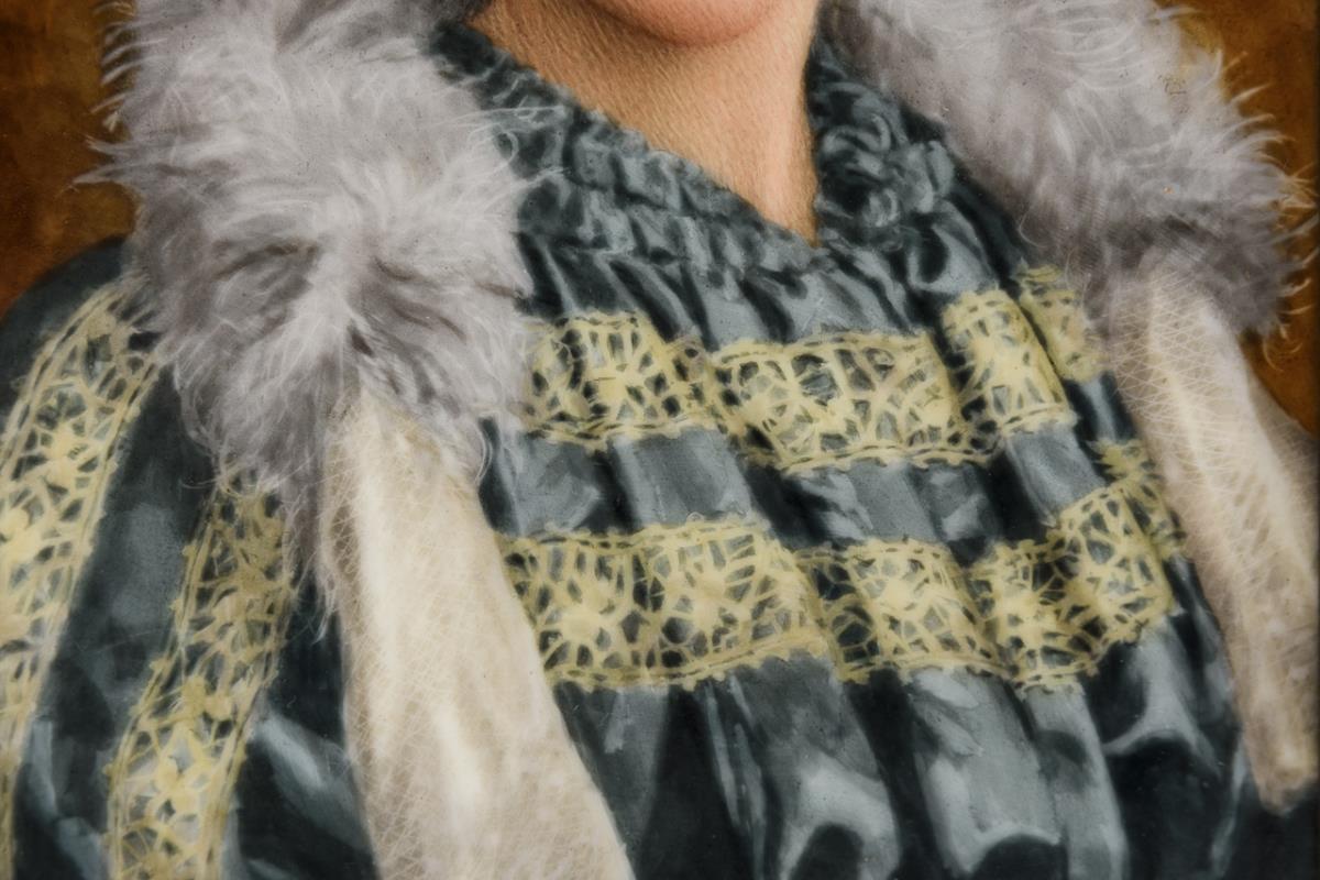 Picture of a young woman with feather collar. On the frame paper label "1886", verso label "Encadrements en tous genres Dorure-Miroiterie / P. Havard / 128 / Boulevard du Montparnasse Paris" and label residue "(...) Budin (...) de Strasbourg (...)".